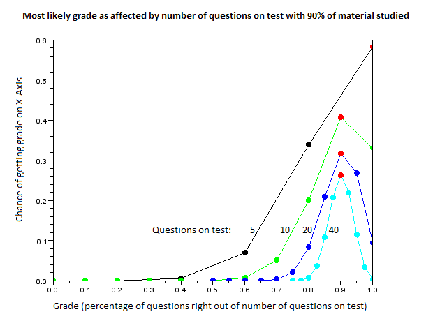 This represents the grade distribution for 90% of material studied on tests with few questions (less than ten). In all of them except 9, the most likely grade is 100% - higher than amount studied, simply due to the quantized nature of the grading. The chances of receiving a lower grade than 90% are also fairly high, about 40% for a test with 7 to 9 questions (this is balanced out by the fact that the grade is close to 90% - yet it is still not the most valuable as an accurate indicator, and certainly the difference between A and B can be felt by the student). In fact, with 9 questions the student who studied at an A level (90%) is most likely to get a B (88.9%)! My advice for teachers is to use at least ten questions, then this issue does not arise (since 1 question lost on 10-question test is 9/10=90% while 8/9=88.9%). Again, not much difference mathematically but in terms of self esteem would you rather get a low A or a high B?