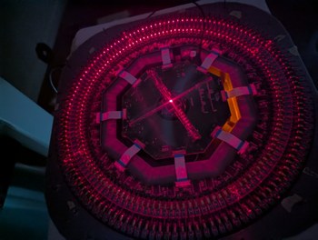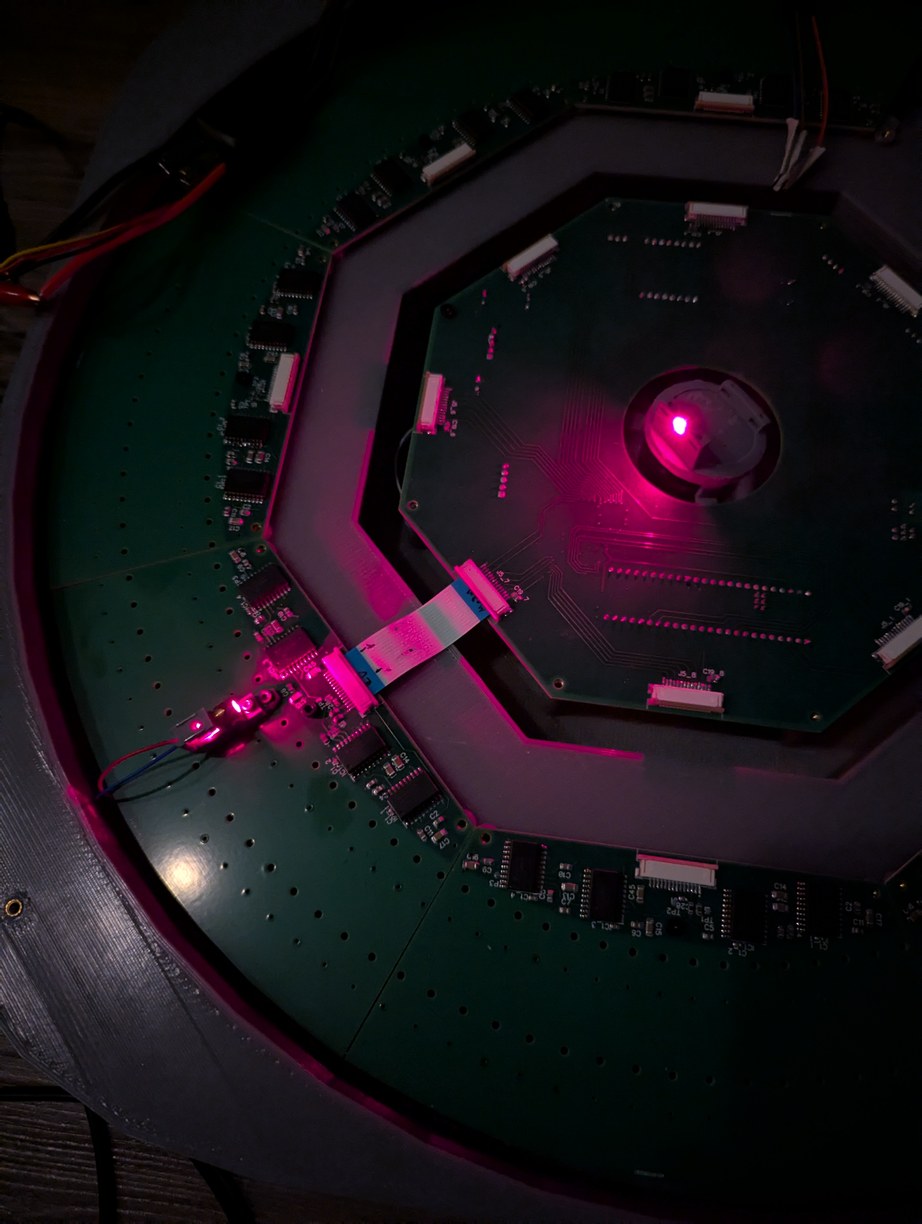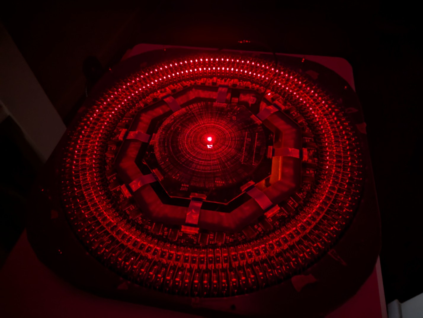 Slow motion capture of scanning through all 256 laser diodes, before alignment and with a cardboard mirror model in center, to test the data communication. A single LD flashes every ms, which is too fast for the camera so multiple LDs appear to be on simultaneously in the frames.