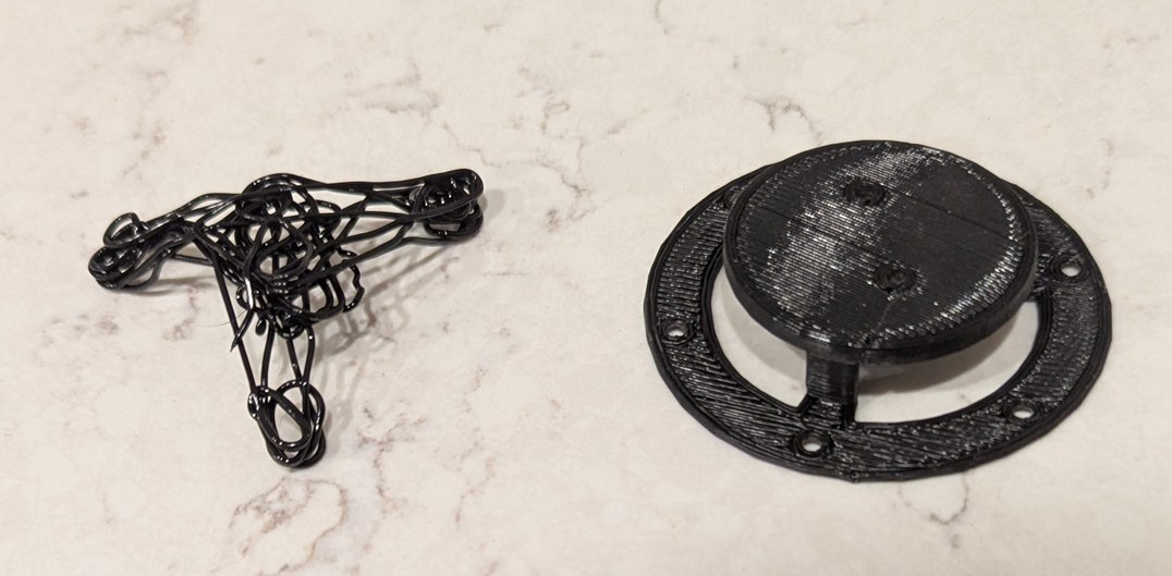Connecting the encoder ring to the motor, I found the performance was not good due to the open regions of the ring being too close to each other. All 512 transitions per revolution could be seen if the encoder ring were moved up towards the top of the optical switch slot, but the ring holder was designed to hold the ring in the middle of the slot, about 2 mm lower. I thought I might make a quick version of a properly sized holder using a 3D pen (a hand-held version of the 3D printer hot end), but with the unsatisfying result I remembered why these pens aren't so popular.