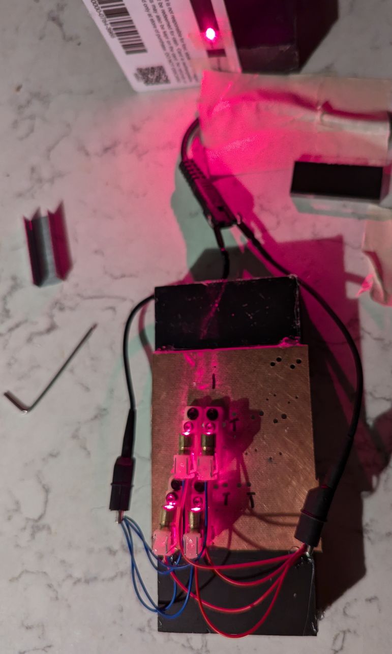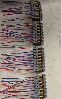 The process took multiple steps, all separated by multiple days, with batches overlapping when feasible. First I printed 33 holders at a time, followed by a rinse in isopropanol solution, and curing with UV lamps for about 10 minutes. Second the holders were left to sit on a somewhat sunny windowsill for a few days, to complete any curing or warping that may have been still going on and to allow volatile components of the resin to evaporate (this may have been more of an issue because the resin was multiple years old and stored without temperature control). Because the thickness of the holder exceeds 3 mm in places, this was a slow process; I could check the progress based on the feel of the printed part, even after initial UV curing it felt soft and rubbery, while after a few days on the windowsill the tactile aspect changed to more of a hard plastic surface. In the meantime I was preparing the laser diodes. I checked the wires that were soldered on, and for about half of the LDs adjusted the soldering so that the supply wire would be centered relative to the LD body, because it has to pass through the hole in the back of the LD holder. Then I checked each one for functionality and adequate brightness, and adjusted the collimating lens to have the beam focus at infinity (or, practically, reflected from a mirror across the room). The focal distance adjustment was quite sensitive, with even a tenth of a turn of the threaded cylindrical portion causing a visible widening of the laser spot. Then I used a low-viscosity "penetrating" threadlock fluid to lock the focus position, so that it does not change during further handling of the LD when installing it in the holder. Unfortunately, after the threadlock dried, some of the LDs ended up not focused as well as they had been during the adjustment, perhaps due to elastic deformation of some components before or after the focus adjustment step, so the focus was visibly imperfect, but with 256 LDs to get through I accepted that this error would be adequate and kept the process going.
