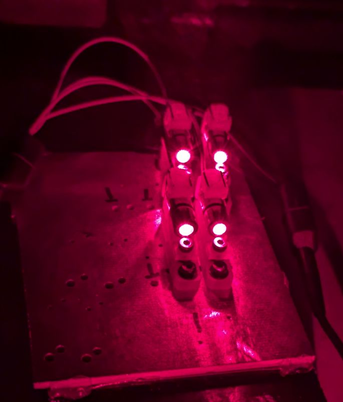 Aligning 4 LDs in holders so they all point to the same spot on a card, and the resulting projected dots on a wall if the card is removed.