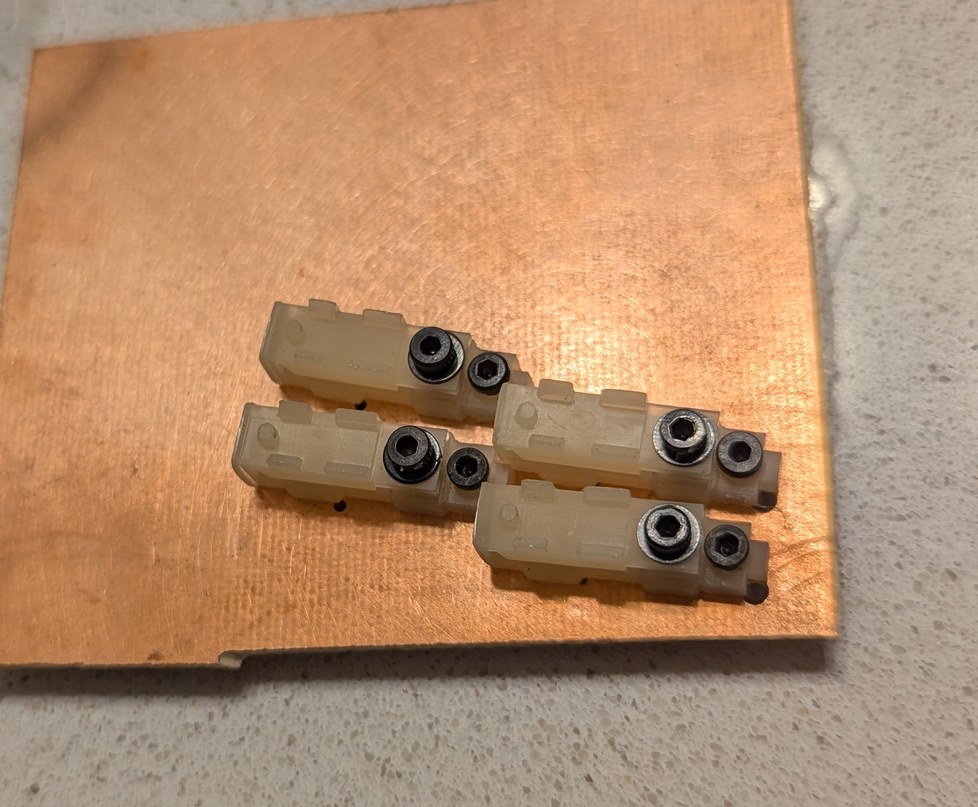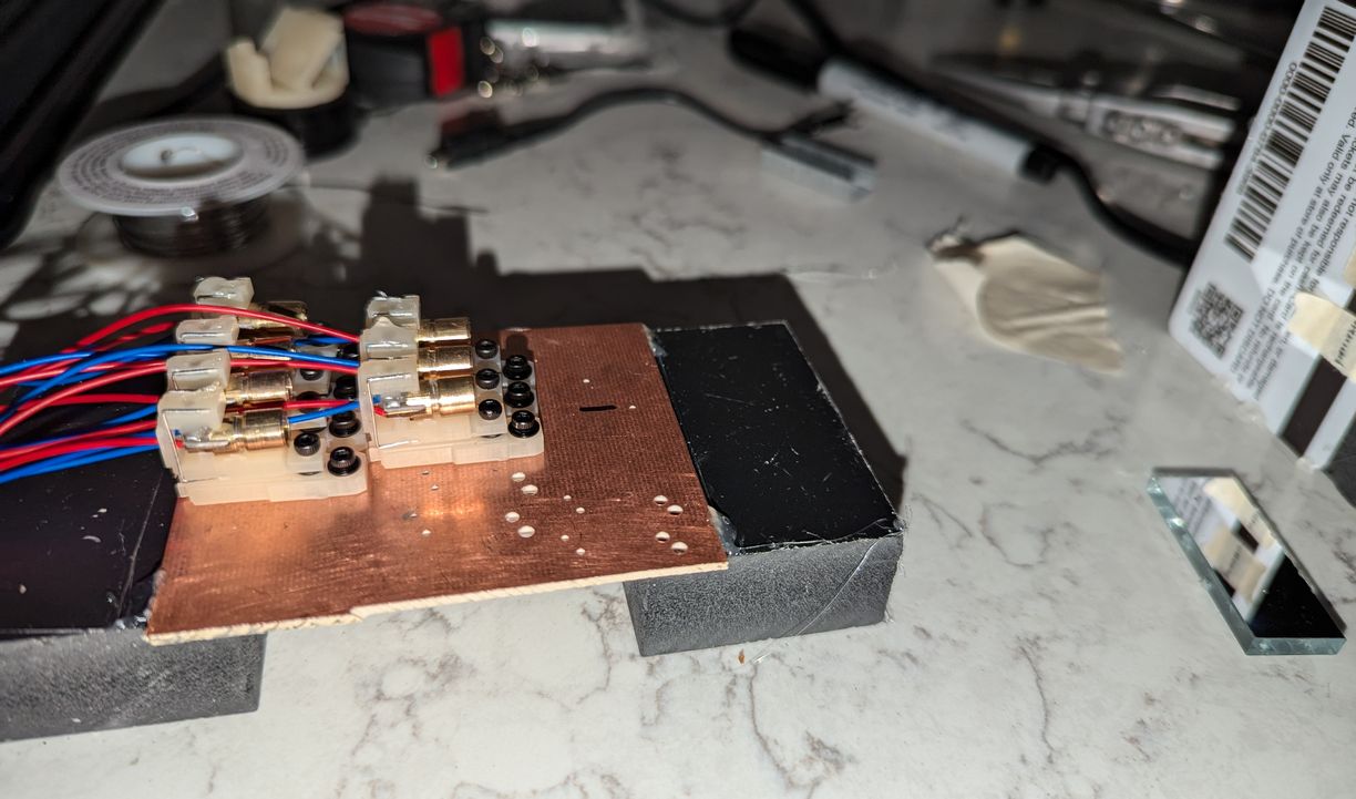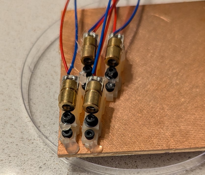 The first design for the LD holders was based on gluing the LDs into place. Here the holders are bolted to an unmilled circuit board, and LDs are glued in place for testing alignment accuracy and stability.