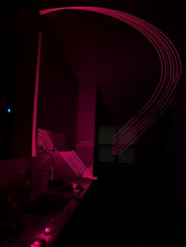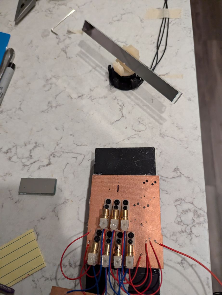 Increasing from 4 to 7 LDs in holders on the test PCB, again aligning to the same spot on a card, and then installing a spinning mirror to validate the reflection calculations and general functionality of this approach. This assembly was glued to various surfaces in the kitchen area of my apartment for many days, to provide a long projection distance to the next wall so the holders could be tested for stability over time, although this made cooking more difficult. The traced out curves looked like the expected "upper half of figure 8" shape (from simulation) for each laser, overlapping in a point at zenith. The curves do not look too clean in the photo because some parts of them are caused by stray reflections from the back angled surface of the mirror; the lasers are on continuously and not synchronized to the motor rotation.