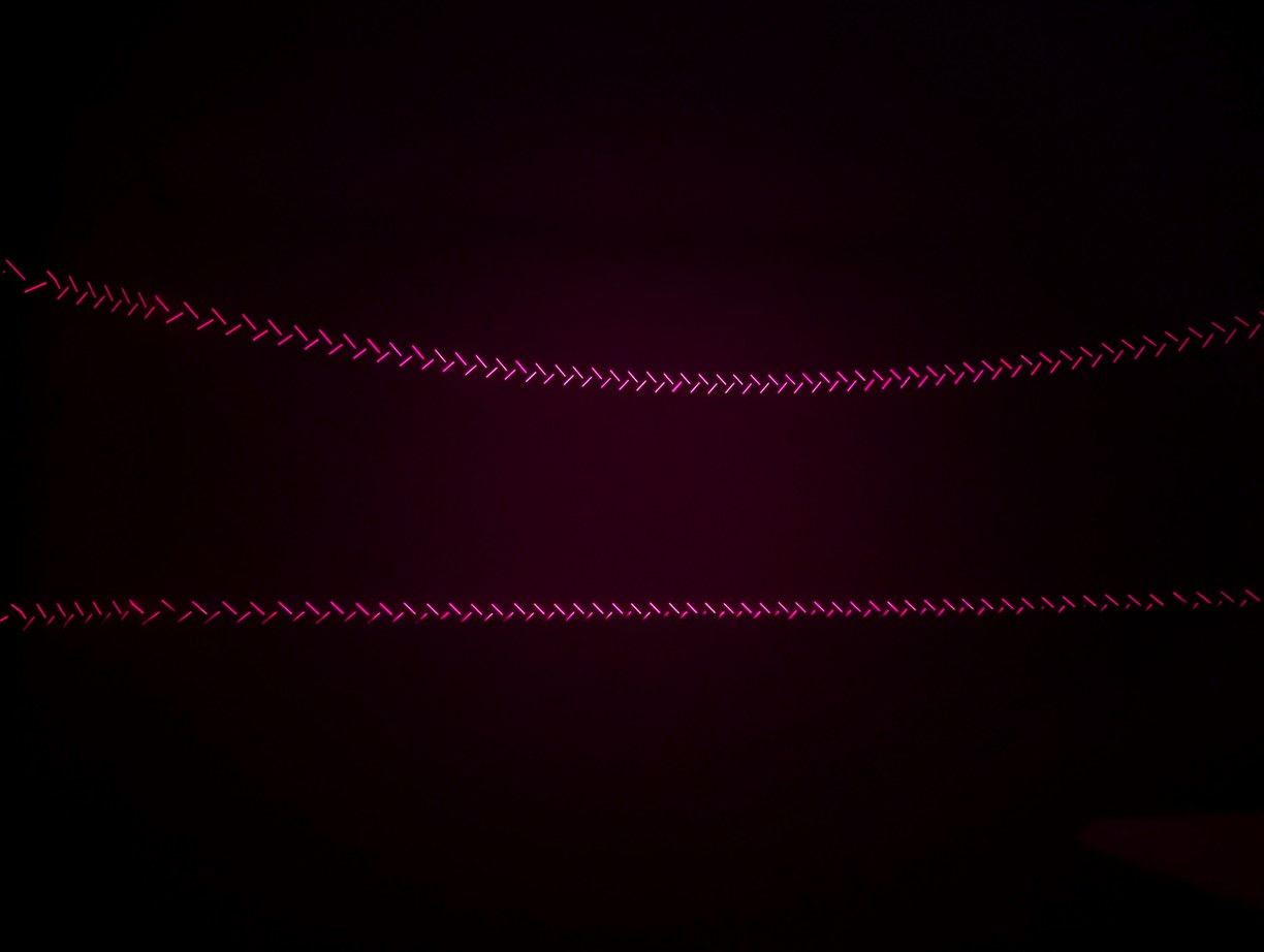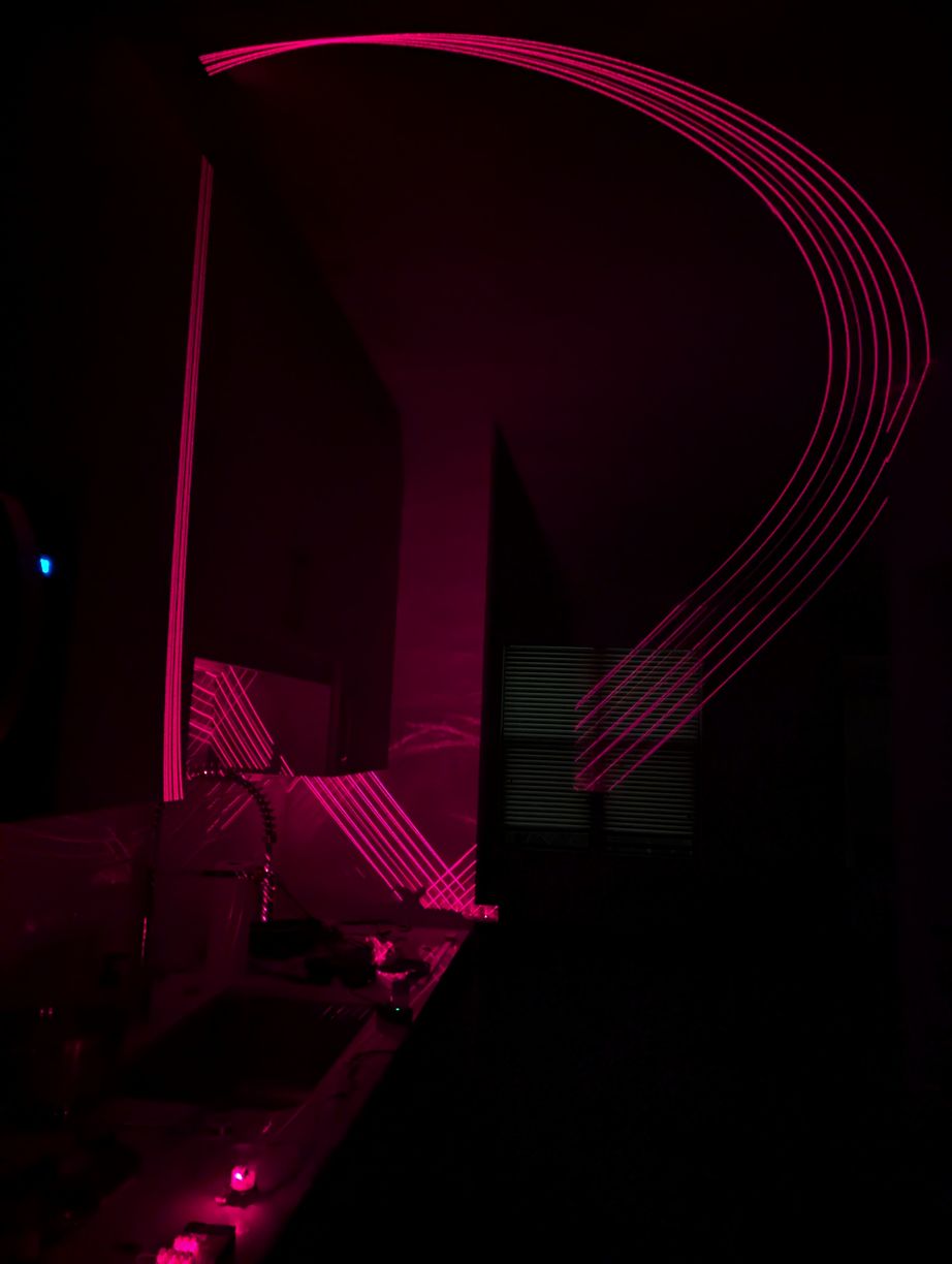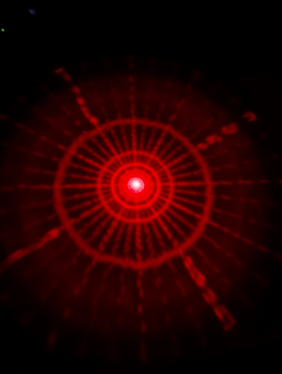 A few more patterns to confirm LD alignment, such as circles which are now more circular than earlier, as well as switching back to the lines of X alignment mode at different phase offsets, creating interesting symmetric images. In the central image, the lower lines are cut off by the top of the projector and represent the lowest projected angle, approximately 2.3 degrees above the horizon.