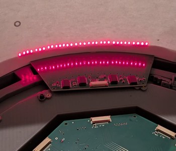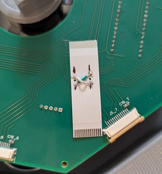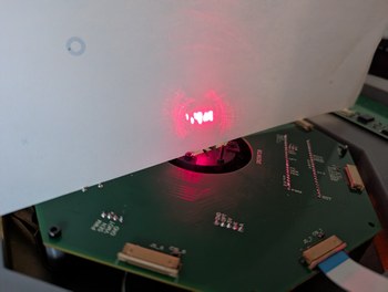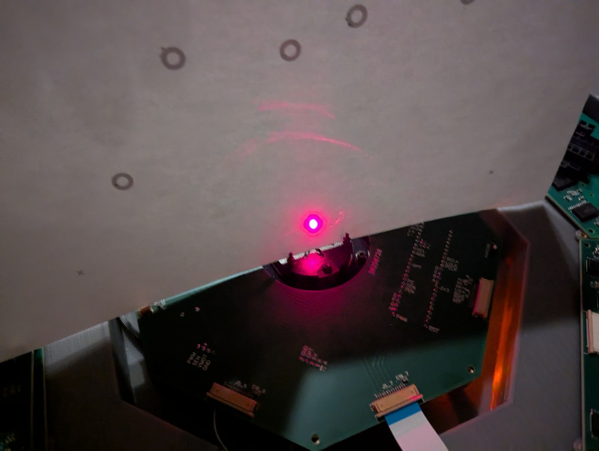 But I was anxious to get first light, and for the sake of expediency, I crossed the lines in the ribbon cable. This was the least risky option as I had bought extra cables, and breaking one does not affect the PCBs. This also allows me to hide the mistake under the cable so it is not visible once the projector is assembled. However, crossing there would involve a discontinuity in the return current; either the grounds would also have to be interconnected at that point, or the repair would have to be done over the solid ground plane of the main PCB (there was too little room on the LD PCBs for an effective repair). For the purpose of the test, though, the cable cross-over worked, and the laser diode still did not turn on. Reversing the order of shifted bits, recalling that the first bit that gets shifted out ends up at the last position of the last shift register, I finally achieved first light as the laser diode turned on with a bright red glow! The same could have been done by just connecting it to a power supply and pressing the "on" button, but still this felt like an accomplishment as the PCBs and firmware functioned as expected, and if it could turn on 1 LD, then it could turn on 256, and that would be quite a sight.