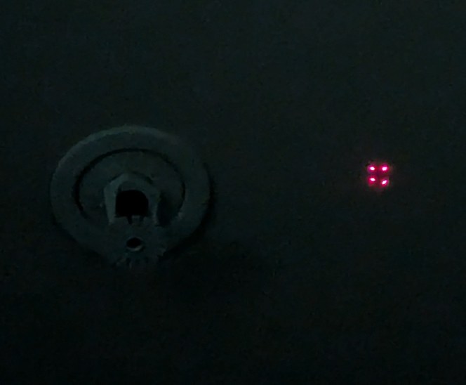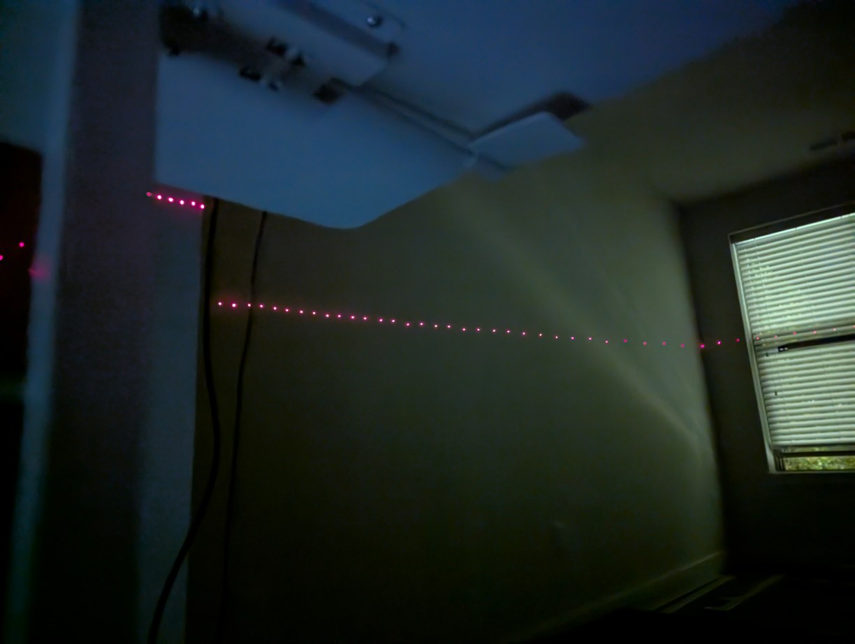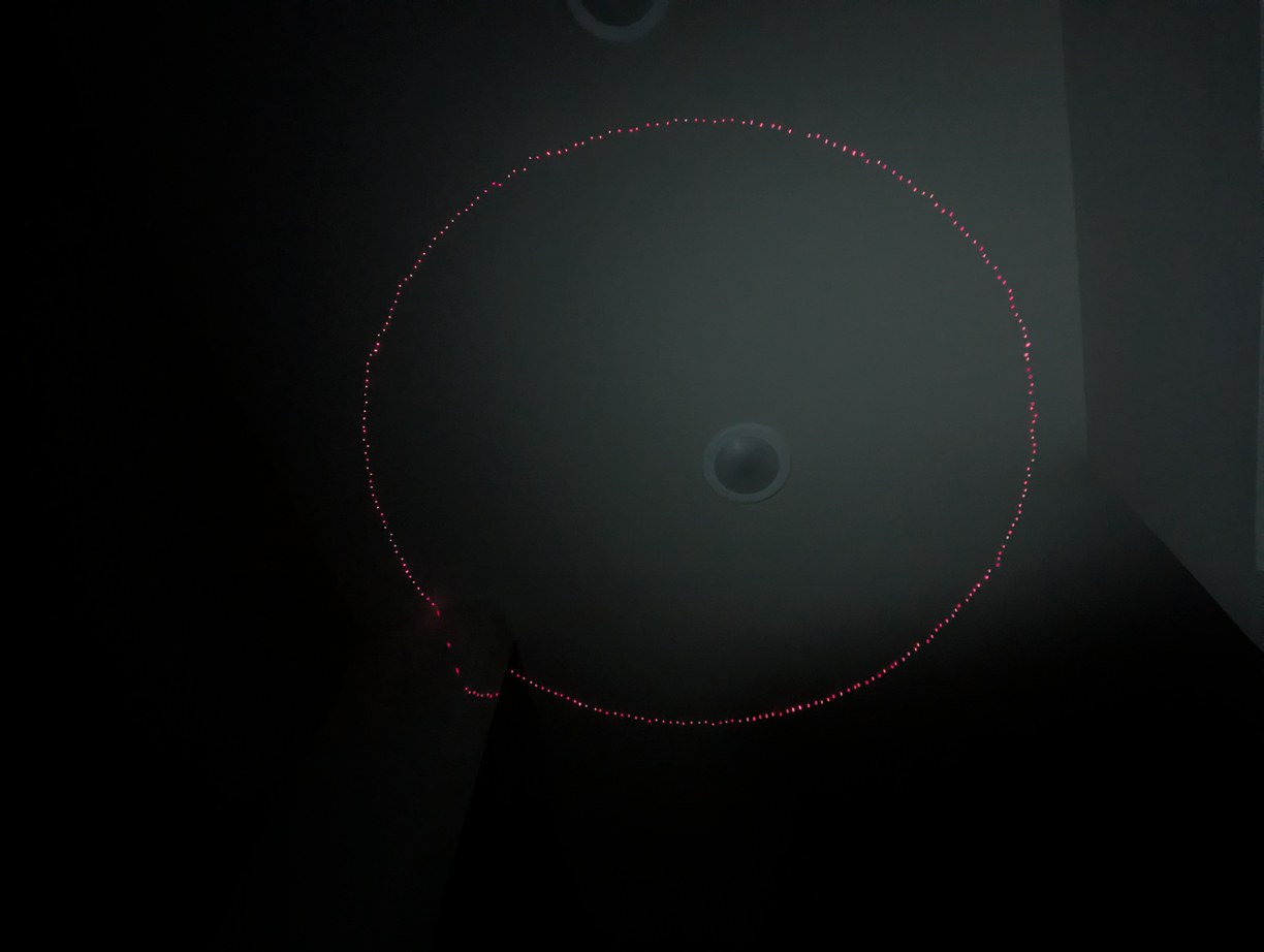 During the alignment steps, I could hear occasional pings from dust hitting the spinning mirror even at 12 RPS, which was not something I anticipated. After a few hours of operation, the side of the mirror that was swinging into the air was significantly dustier than the opposite side. With the mirror verified to be at a 45 degree angle, I used the same 4-laser pattern from before, but instead of crossing lines I overlapped individual pixels, which was more precise. After a warm-up time of a few minutes for the mirror and motor to reach a stable temperature, I would align all pixels to a central zenith reference. In this point all LD beams will ideally intersect at a mirror theta angle generated by accurate division in software, so I aligned all LD holders one by one (in groups of four) so they would all overlap at the zenith point. Previously I positioned the projector under a fire sprinkler and used the center of the sprinkler to mark the reference point, however depending on where I stood near the projcetor the floor would be deflected and the projected point on the ceiling would move by more than a pixel spot size, so for the more precise alignment instead of a physical object reference I projected a calibrated pixel to which I aligned all others. This pixel alignment took about an 8 hour work day.