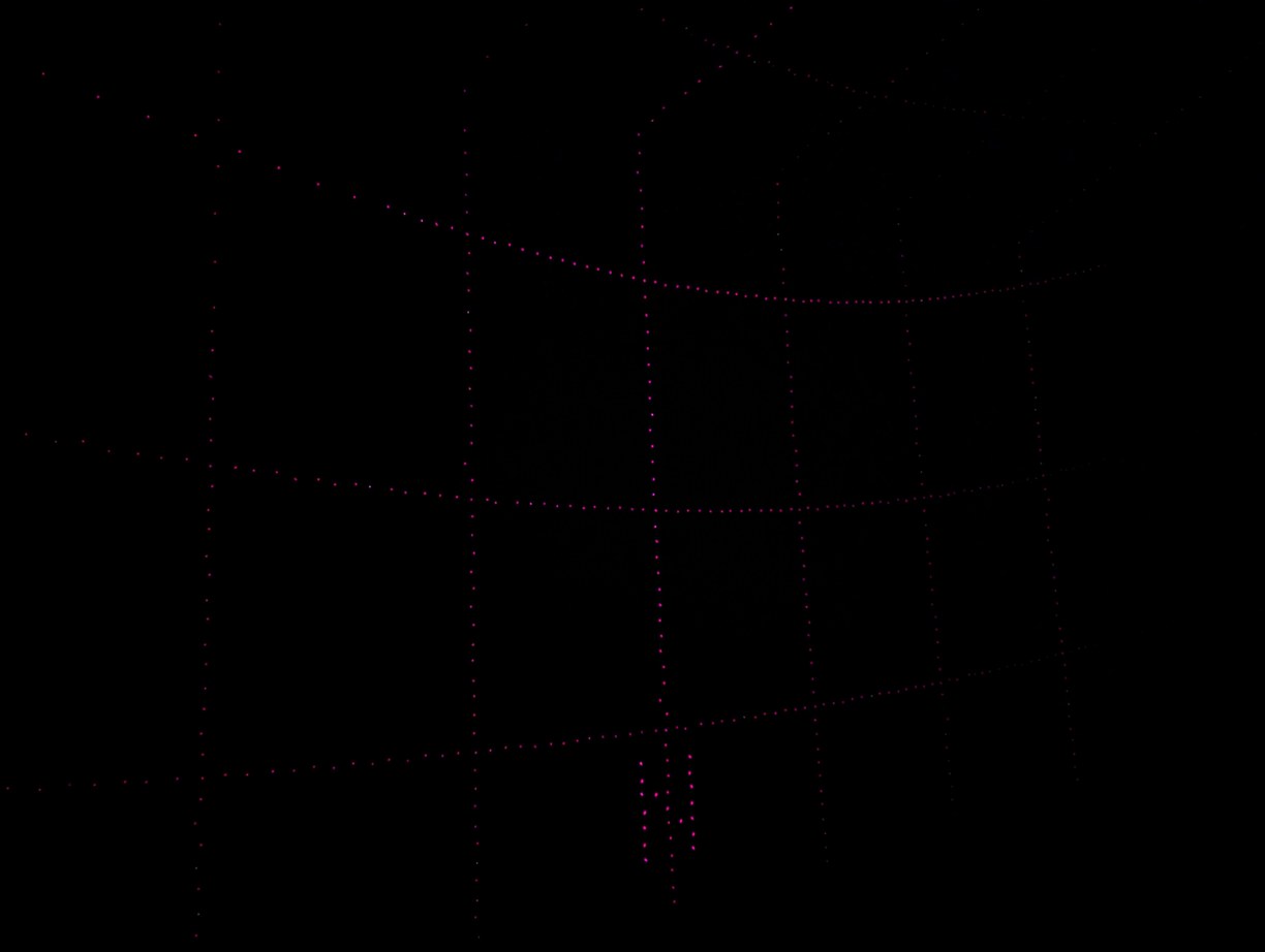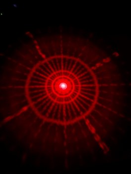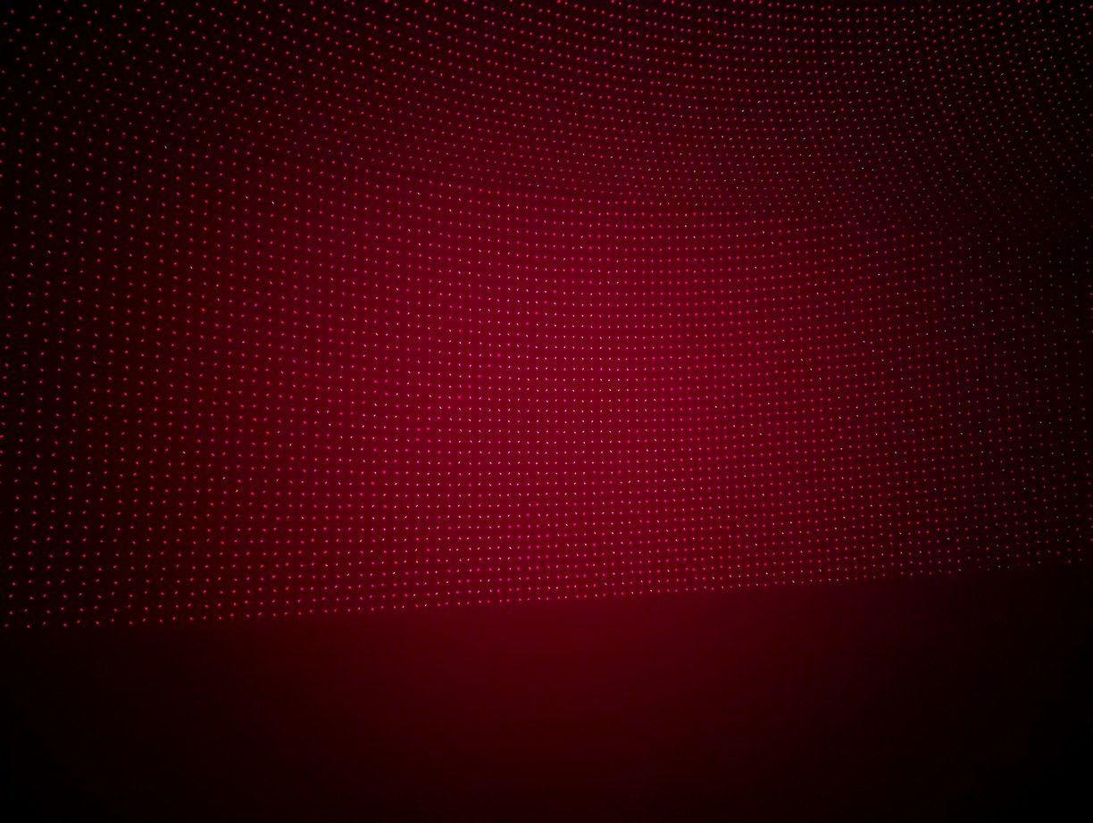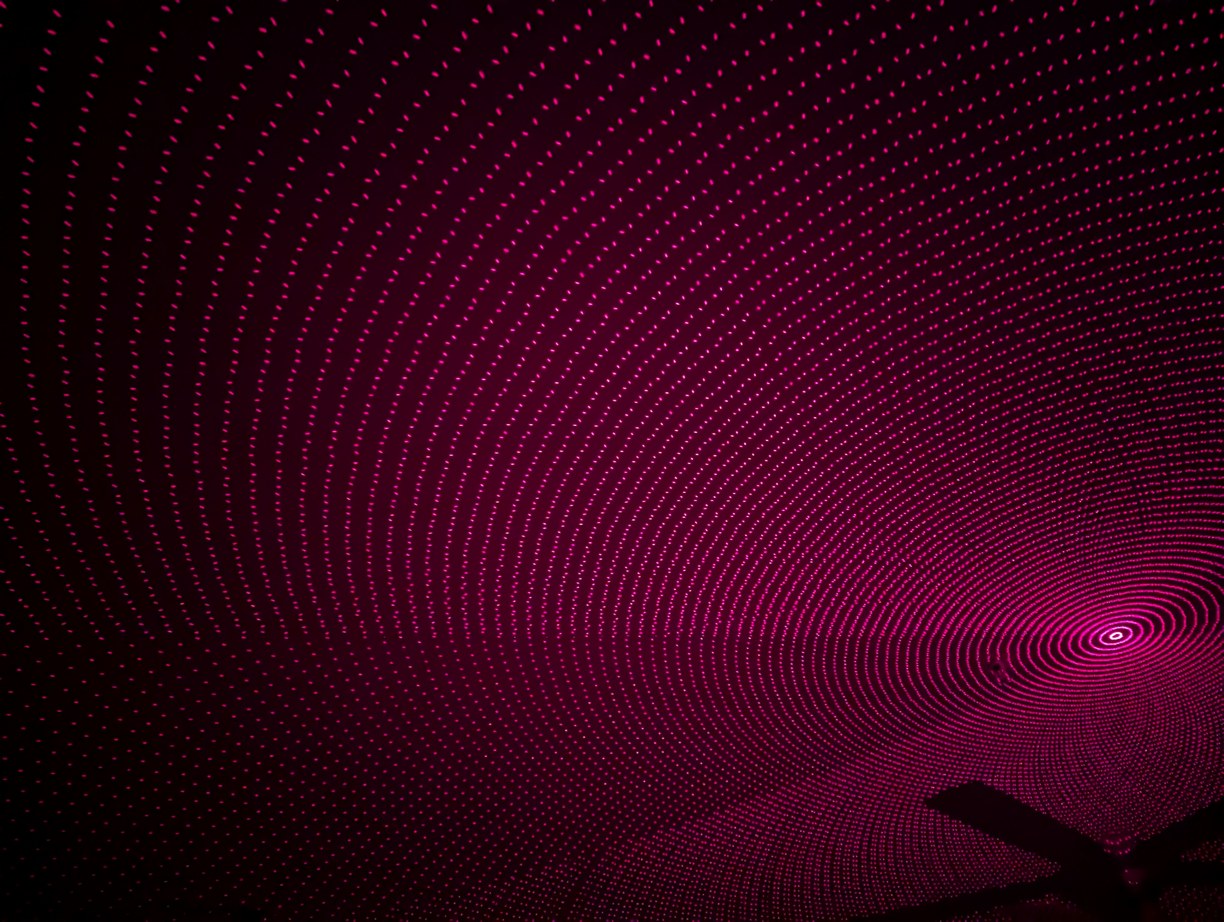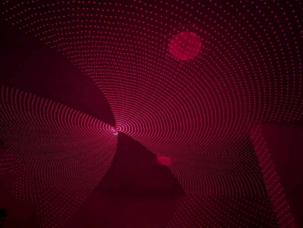With the same pattern as above, on left, placing the lid (through which the diffused laser beams can be seen) on top of the projector causes the spherical coordinates to be projected onto a plane. On right, without the lid, the laser beams look like they are all emitted from the virtual center point.