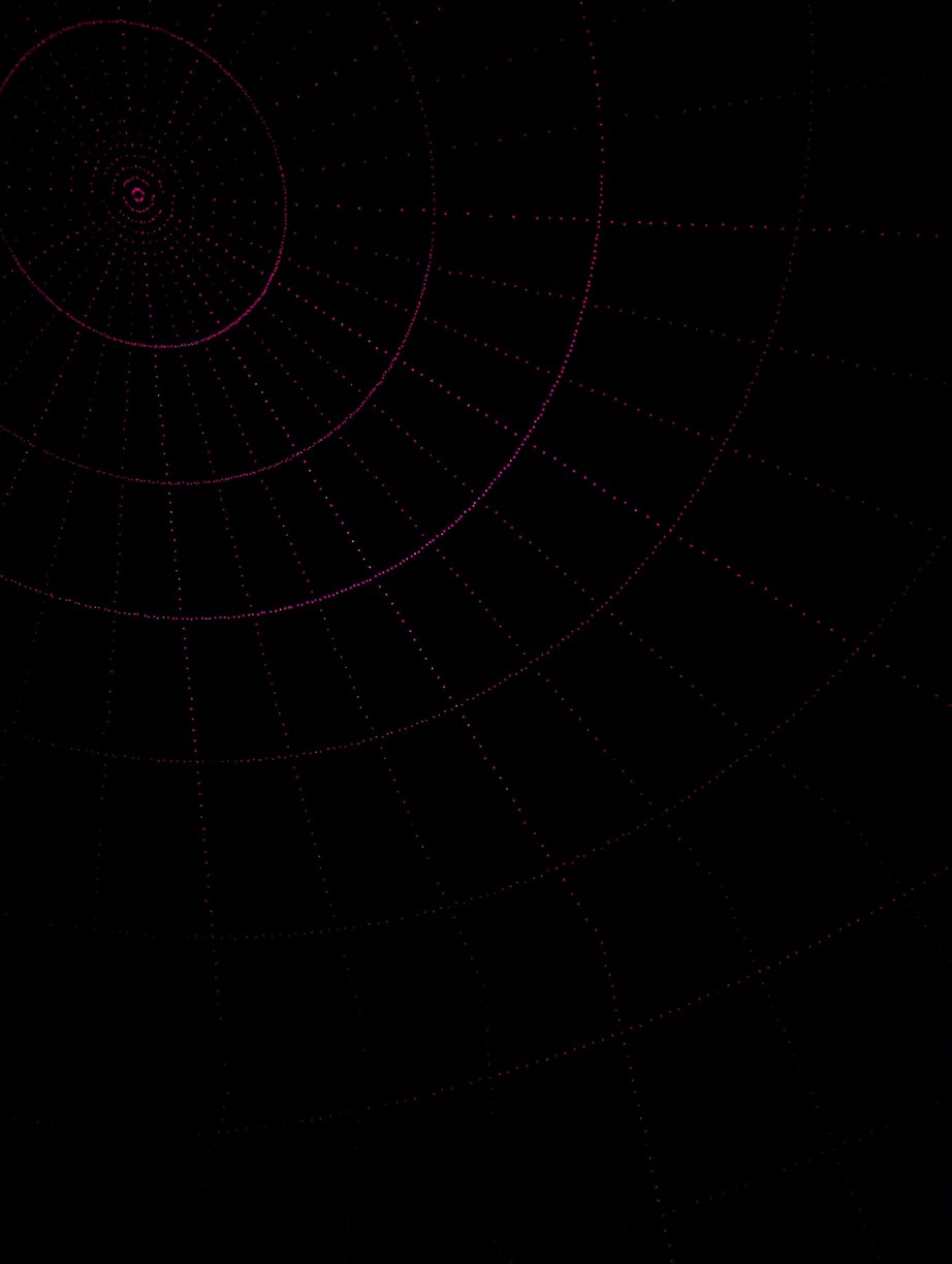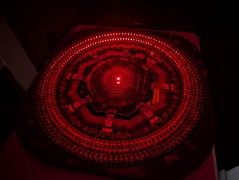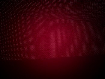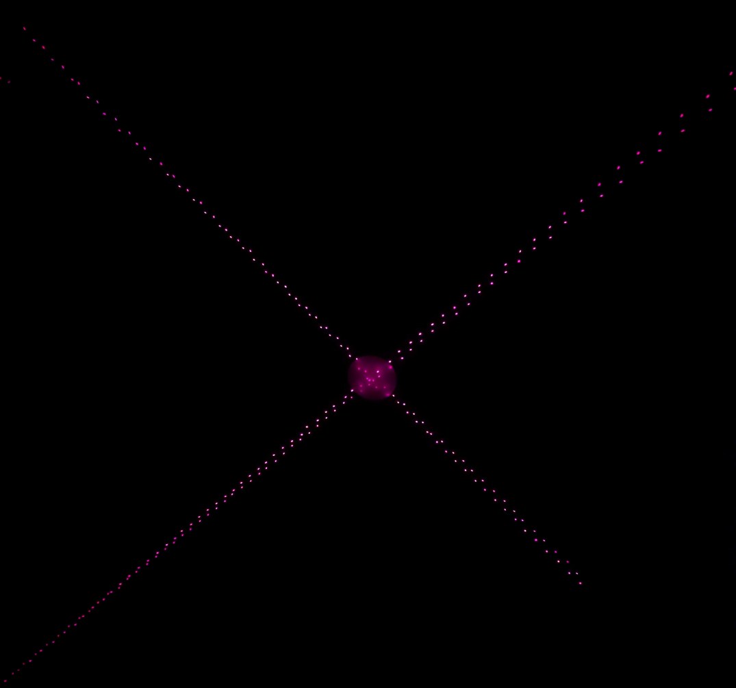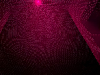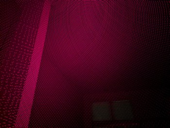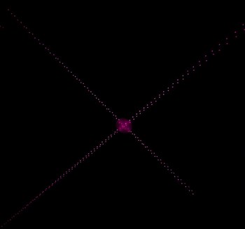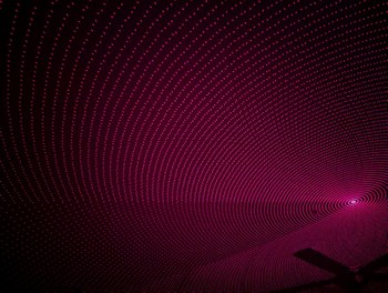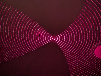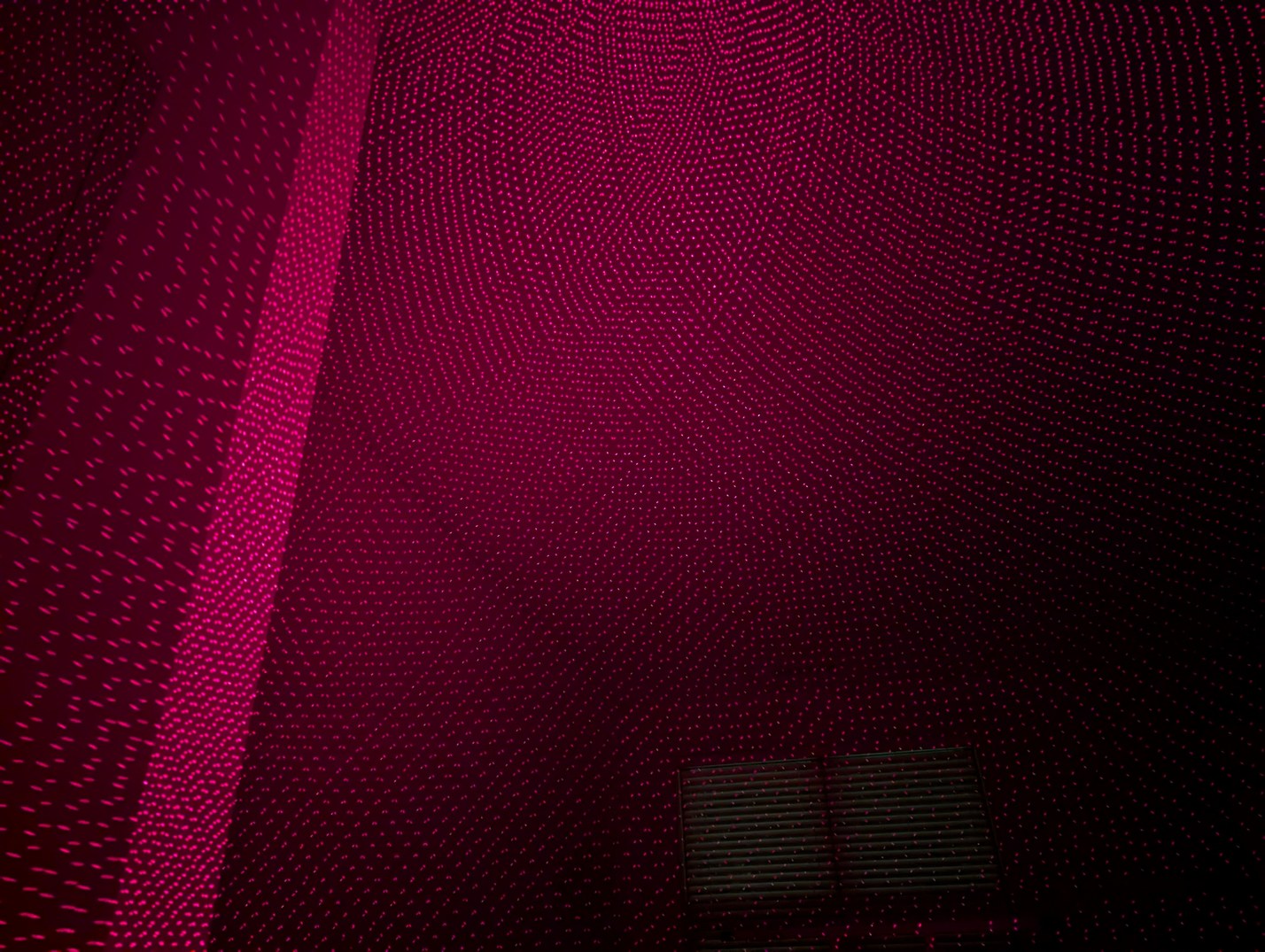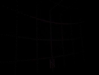 With the same pattern as above, on left, placing the lid (through which the diffused laser beams can be seen) on top of the projector causes the spherical coordinates to be projected onto a plane. On right, without the lid, the laser beams look like they are all emitted from the virtual center point.
