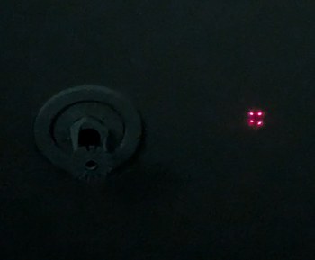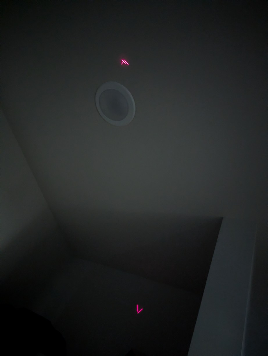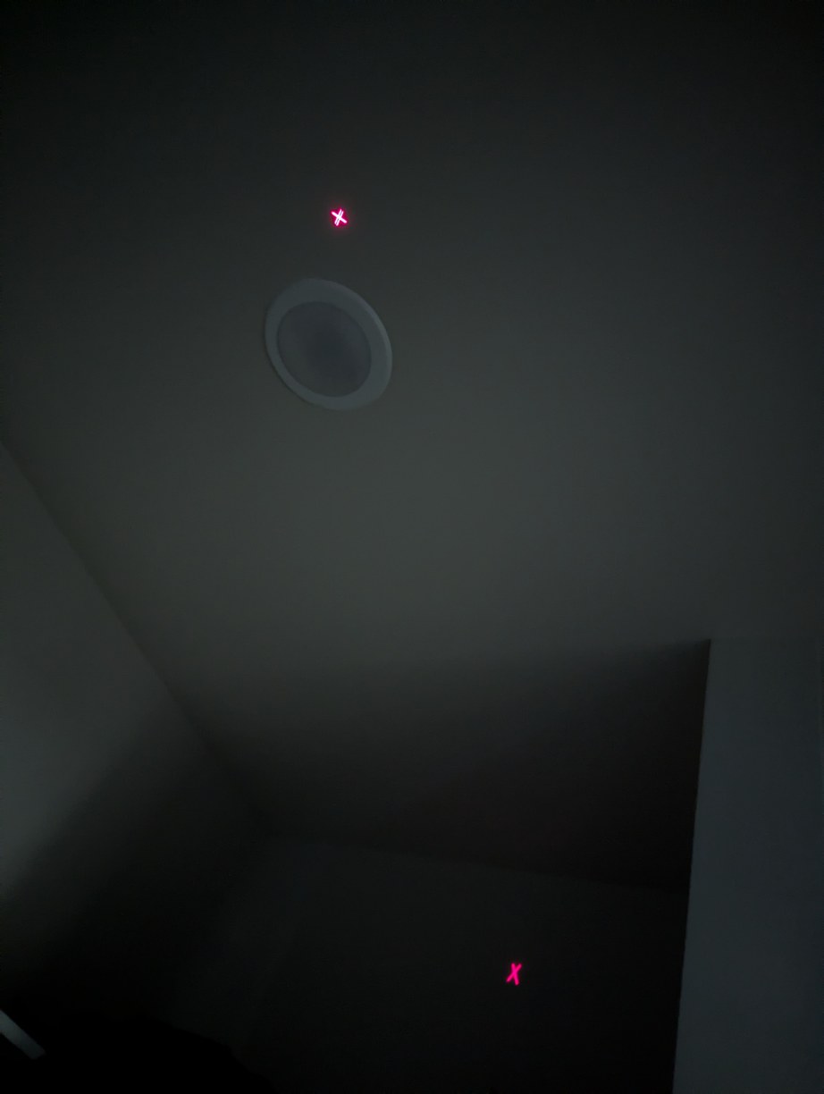 The pixel intersection alignment is similar to the X alignment, but with the lines of the X reduced to dots for higher accuracy. The process is difficult to convey in a photograph as it's just dots on a ceiling, but as an illustration the 4 dots shown here would be overlapped into a single dot by adjusting the corresponding LD holders. When 4 more overlapped dots surround this central one, a correct alignment solution is found.