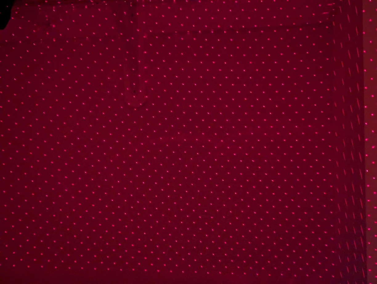 For the first PCB (32 LDs) I aligned the LD holders by using the back section of the mirror holder installed on the motor. This was an aperture slightly separated from a flat surface, working on the pinhole camera principle, such that if the laser beam is aligned to the mirror center, it passes through the center of the aperture and lands on the center of the surface behind it. The LDs were pulsed at low duty cycle so the beam could be viewed comfortably. This approach worked reasonably well, however due to the motor cogging torque, this required using one hand to hold the mirror holder at the correct angle, while using the other hand to adjust the LD holder. I found that a more convenient method was to remove the mirror holder and to aim the laser from one LD into the LD directly opposite, which implies passing through the center of the assembly. This allows using both hands to adjust the LD holder, and the method works even when the LDs on the opposite side are not well aligned, because lateral displacement errors have a small effect on angular pointing direction due to the distance across the projector. As long as the LDs are known to be largely uniformly spaced around a circle, which is achieved with the LD holder dowel pins on circular arcs and visual alignment of the PCBs, aligning the LDs to each other will give a reasonably uniform pixel basis. I used a 6 mm wide piece of paper placed in front of an LD, then powered on the LD opposite the paper, and adjusted the holder of the latter LD so the laser beam would strike the paper in plane with all the other LDs. The LD holders somewhat adhered to the PCB and the bolts, which might be good as it would help maintain stability after alignment, however during alignment this required a few extra steps to first break the adhesion between the parts, after which the full adjustment range could be utilized. In a few cases I had to take out the LD holder and redo the coarse adjustment of the LD, which was possible to do without disturbing surrounding LD holders. Overall the process was slow - it took a bit over a week to complete (with lots of break time, so I could maintain focus on the process while active) - but hey, this is more lasers than the NIF. I was really hoping that this process would not need to be repeated due to parts becoming misaligned over time (due to plastic deformation, vibration, or some other factors). Nonetheless it was feasible, with the theta and phi adjustment mechanisms functioning as intended, so all LDs were able to be aligned. Having gone through this process, unfortunately I did not feel a sense of accomplishment, as I was ready to be finished with this work but there were still more alignment steps to do. I put in a small mirror to test the projected beams, and saw a uniform line of points as expected.