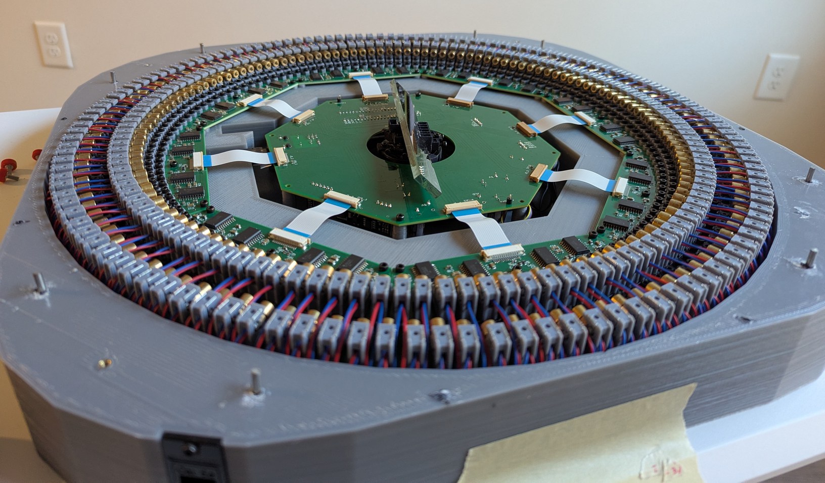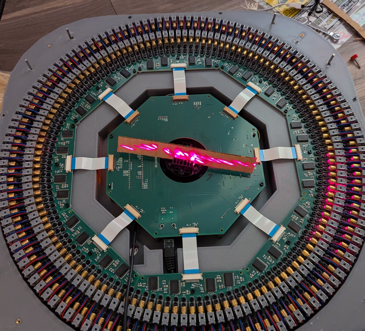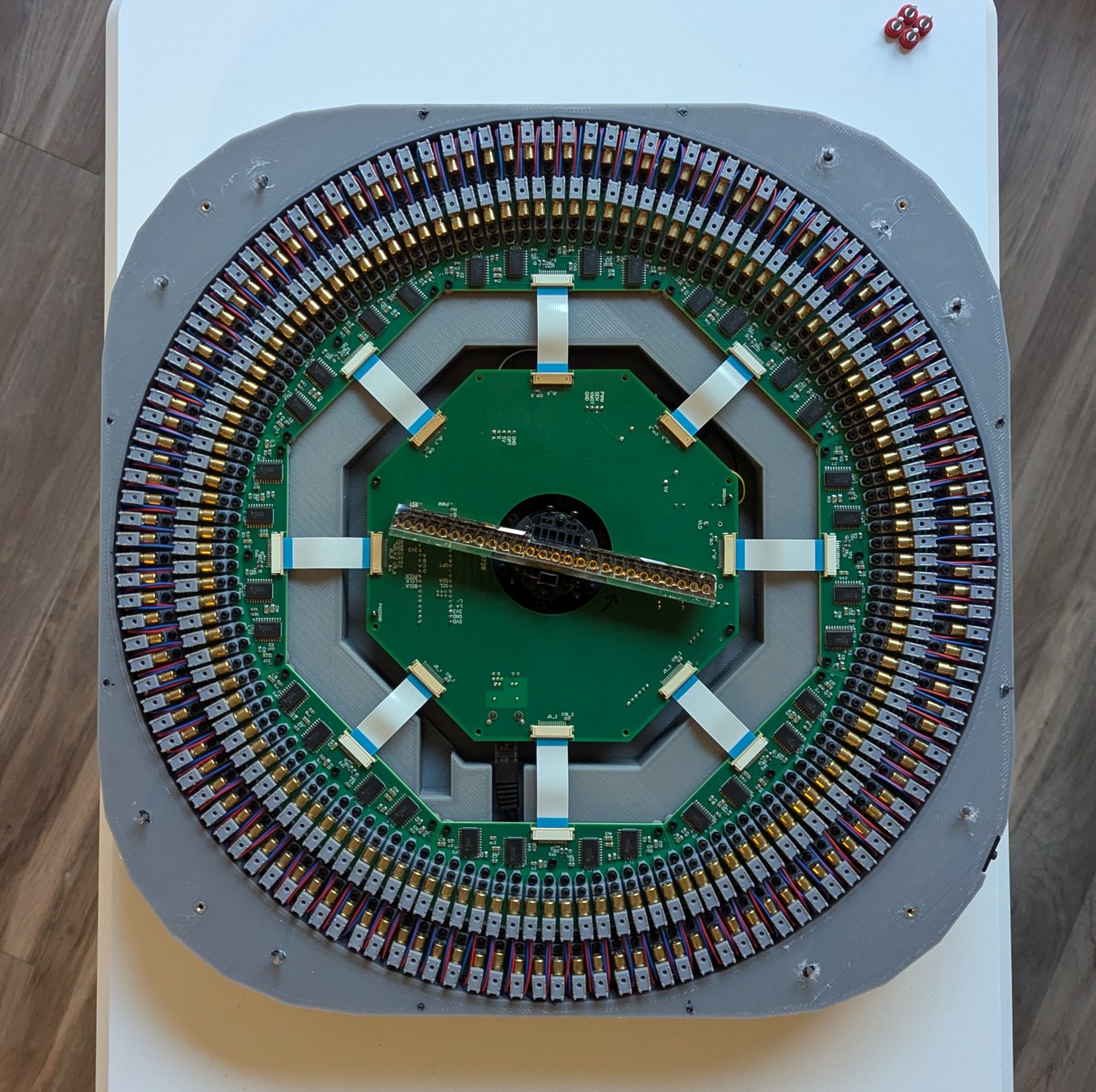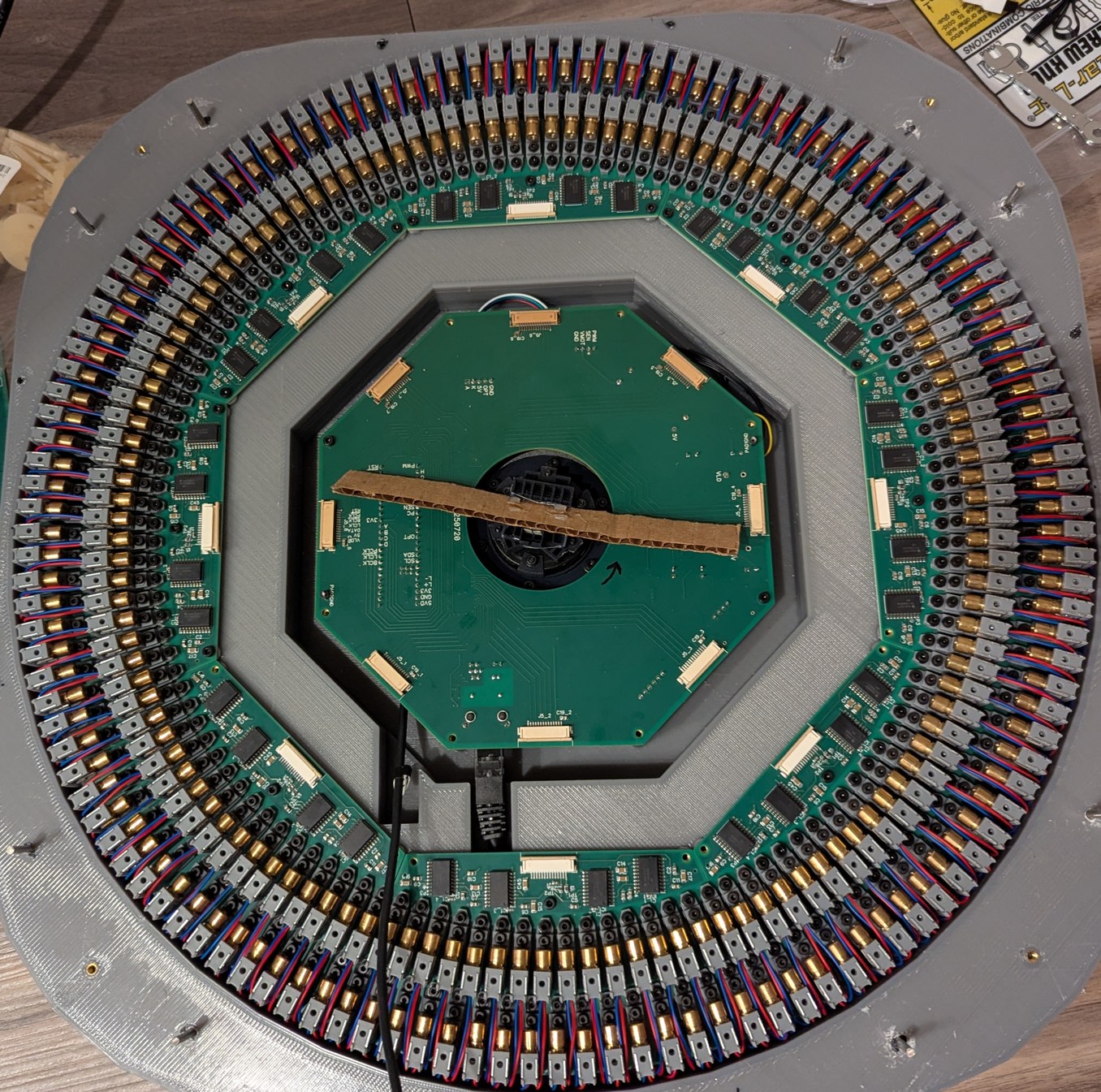 Assembling the LDs and boards. Left, 128 LDs done, with the new encoder ring and motor and accelerometer visible. Right, all 256 LDs done, with the main PCB connected and a cardboard model of the mirror installed on the motor.