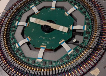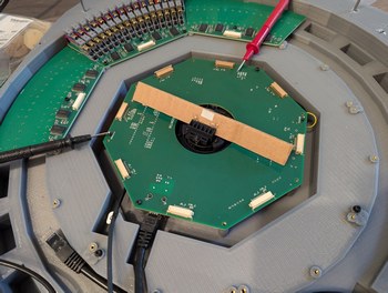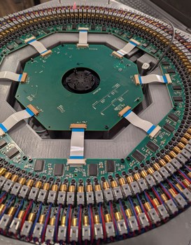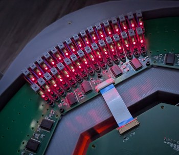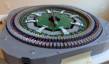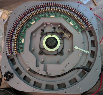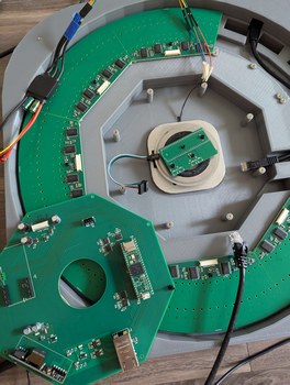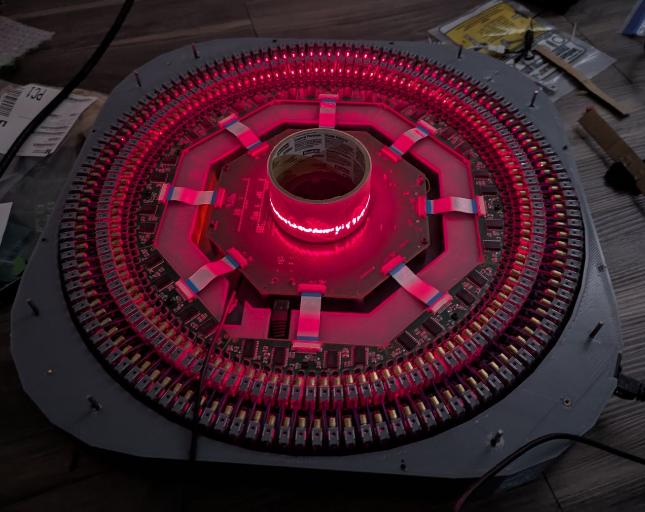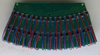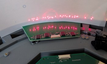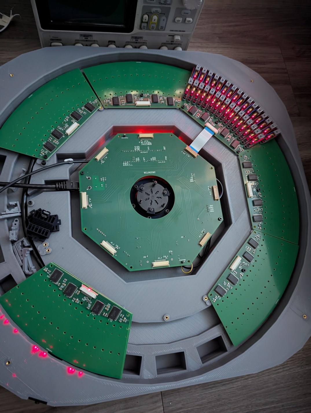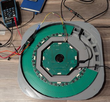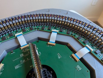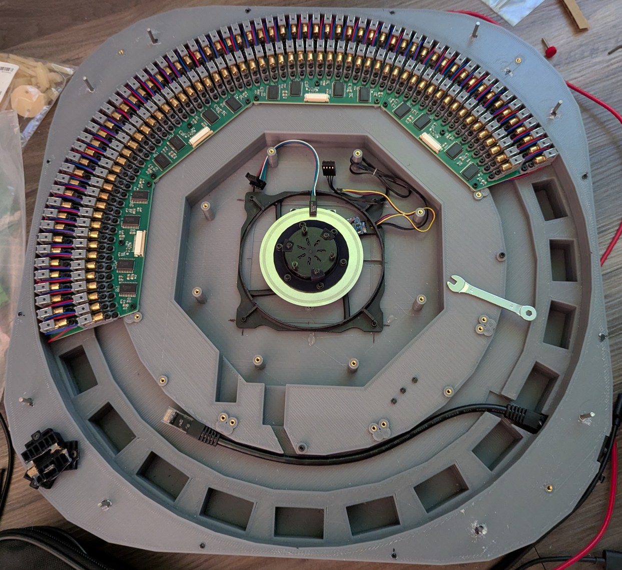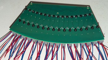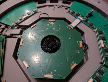 Assembling the LDs and boards. Left, 128 LDs done, with the new encoder ring and motor and accelerometer visible. Right, all 256 LDs done, with the main PCB connected and a cardboard model of the mirror installed on the motor.