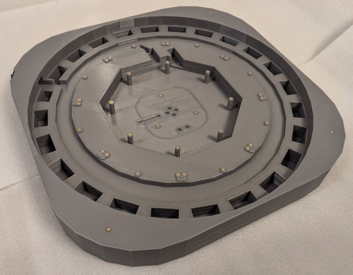 Completed projector with lowered lid protection pins. The outer metal pins mark the lowest angle at which the projector can draw pixels. The top of the projector appears too open, as if there should be another enclosing structure to aid in keeping the LDs aligned or the mirror protected from dust, however this layout is required because the entire hemispherical angle range above the LDs and mirror is used by the projector.