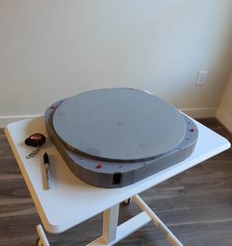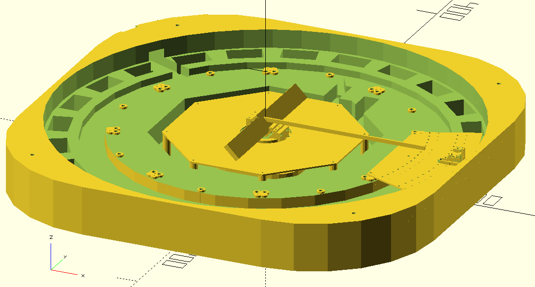 While I had the electrical side of the circuit boards fairly well defined, the mechanical side was still in development. In particular, I needed to know what size the boards should be and where the mounting screws and cable connectors should be located. For the LDs, this meant I needed to know the shape of the LD holders and their mounting hole patterns. For the main board, this meant I needed to know the shape of the motor, mirror, and encoder assembly. For both, I needed to know the relative sizes to pick the right flexible cable to connect the boards. The relative vertical levels of the boards also need to match the motor, mirror, and encoder, for proper optical alignment of the laser beam plane with the mirror center, and for adequate clearance of components under the main board and any associated wires from the spinning encoder ring underneath the board. All of this in turn informed the design of the case for the projector, which would further need passageways for the cables and a way to match all the heights and centerlines for optical alignment. The design of these inter-related parts was iterative, and whereas I did my best to define clear variables in OpenSCAD that would be used for multiple parts (for instance, the same hole position variable would be used to define a threaded hole in the base, a drilled hole in the motor holder, and the position for a component in the preview 3D render, therefore changing this one variable would update all three parts so they remain consistent with each other), it was still necessary to manually match up values with those used in DipTrace files. Finally I had a projector base that was 44 cm on the side and 5 cm tall, which could be 3D printed with a 20% infill density (meaning that it would not be necessary to expend the effort to create ribs or other stiffening structures while maintaining a light-weight and economical part). A remaining worry was whether the 12 inch ethernet cable would lay properly inside the base - if it was too short it would not reach the board, and if it was too long it would deform and push one of the LD boards causing optical misalignment. To confirm the sizing, I scaled the 3D preview window to life-sized scale and traced out the image from the monitor onto a piece of paper held against it, then laid the cable onto the piece of paper, bending it at the indicated boundaries from the design. This low-tech method worked well to confirm the fit of complicated to model geometry like the cable.