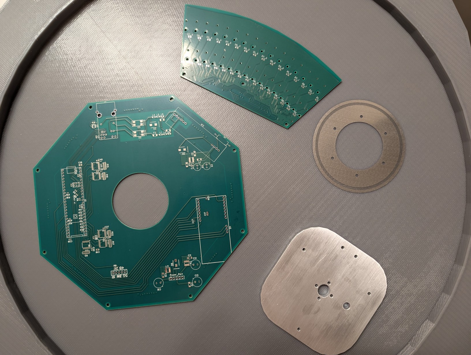 It was time to send off the circuit board and 3D print files to PCBWay for manufacturing. (The DipTrace files are available here and OpenSCAD files are available here.) For the optical encoder, I ordered a SMD stencil with a DXF file of the cutout shape (generated with OpenSCAD), and as before they correctly processed this unusual request without complications. This was the time of peak tariffs, so I actually ended up paying more in tariffs than the parts themselves cost, but I suppose thwarting creativity is the essence of business and politics. It would almost have been cheaper to book a flight to China and carry back the parts in a suitcase, but I did not want to risk getting questioned at either border, even though there is nothing illegal about transporting one's own hobby projects (yet). This extortionate scheme also meant that I did not order the LD holders from PCBWay, deciding instead to print them myself as I had done with the prototypes, which had the slight advantage of giving me more time to improve the design (and more confidence the design would work, since my files were fine-tuned at the 0.1 mm level for the particular printer and resin settings I had used in prototyping so far). The motor holder, which was made from laser-cut aluminum, could have been ordered from sendcutsend, however my past few experiences with them showed that they do not do a great job with deburring the edges of parts, and in one case bent the parts due to improper tab placement. I ordered the motor holder from PCBWay for the sake of comparison, and as expected the piece came back with all the outer and hole edges well deburred. The encoder ring holder was difficult to print without warping and was best suited for a powder process such as SLS, and this was the first time I got a reasonable quote price on xometry, so I ordered from them (I had attempted ordering from them as early as the ddr pad project, but it seems that for anything exceeding the size of a small trinket, the prices become astronomical - for instance the 44 cm projector base by itself would have cost more than the entire PCBWay order with tariffs included!).