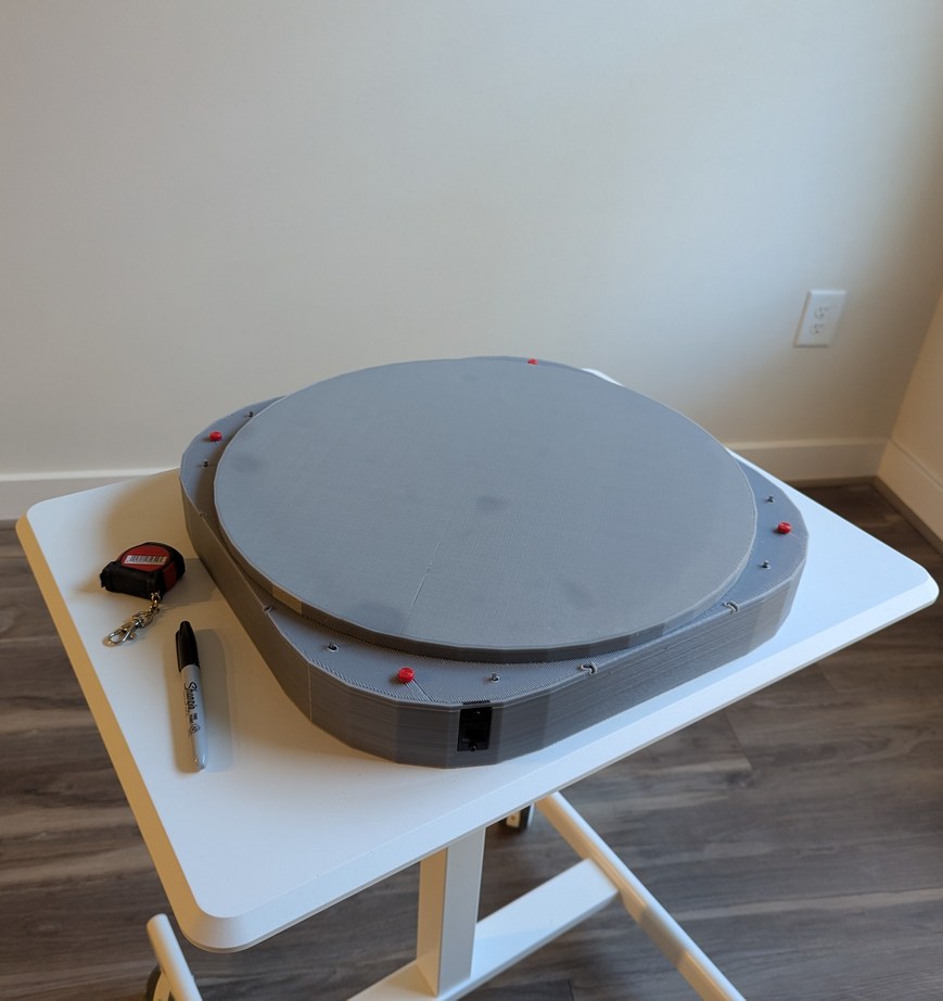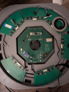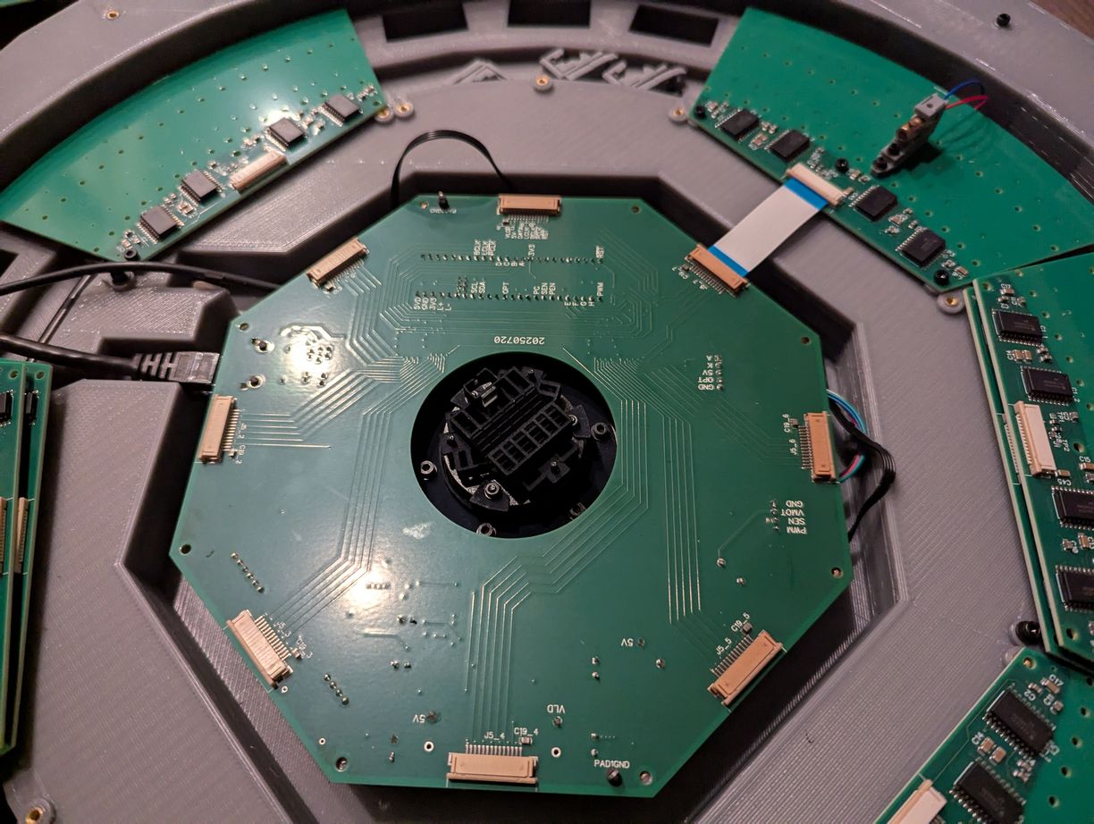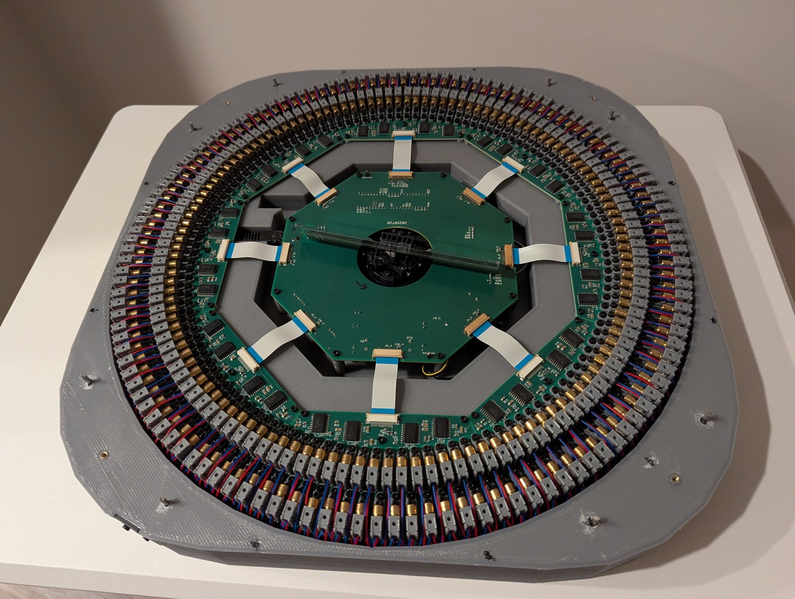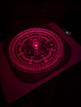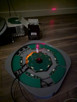 With the lid installed, I could transport this project to different locations for demonstration. Over weeks some LDs moved slightly out of alignment, but this is largely inconsequential for viewing star maps (it would be quite noticeable for viewing bitmap graphics). Initially I planned to use hot glue to secure all LDs after alignment, but I became worried about the risk of the glue somehow making things worse and then being unable to adjust anything without taking apart all the boards; instead I decided to leave everything unglued so that individual LDs that drift out of alignment can be adjusted back with ease. Overall this project has been a marathon - some of the first sketches are from August 2024, and it seems that each part has required multiple iterations - but I am happy to say that the project has met all the original design goals. It is indeed possible, with great patience, to align 256 laser diodes held in 3D printed resin parts, and to synchronize them to a spinning mirror with better than 0.1 degree resolution.