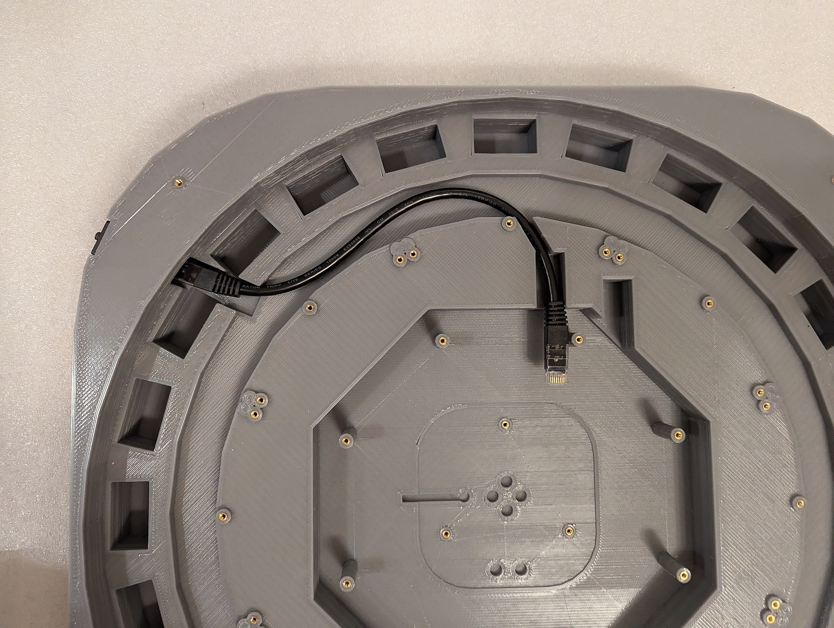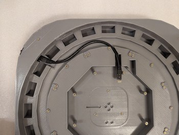 Testing the fit of the ethernet cable, motor holder, and PCBs inside the projector base. The wires coming from under the PCB are from the optical switch, and here I determined the length to which they can be trimmed to allow easy removal of the main PCB.