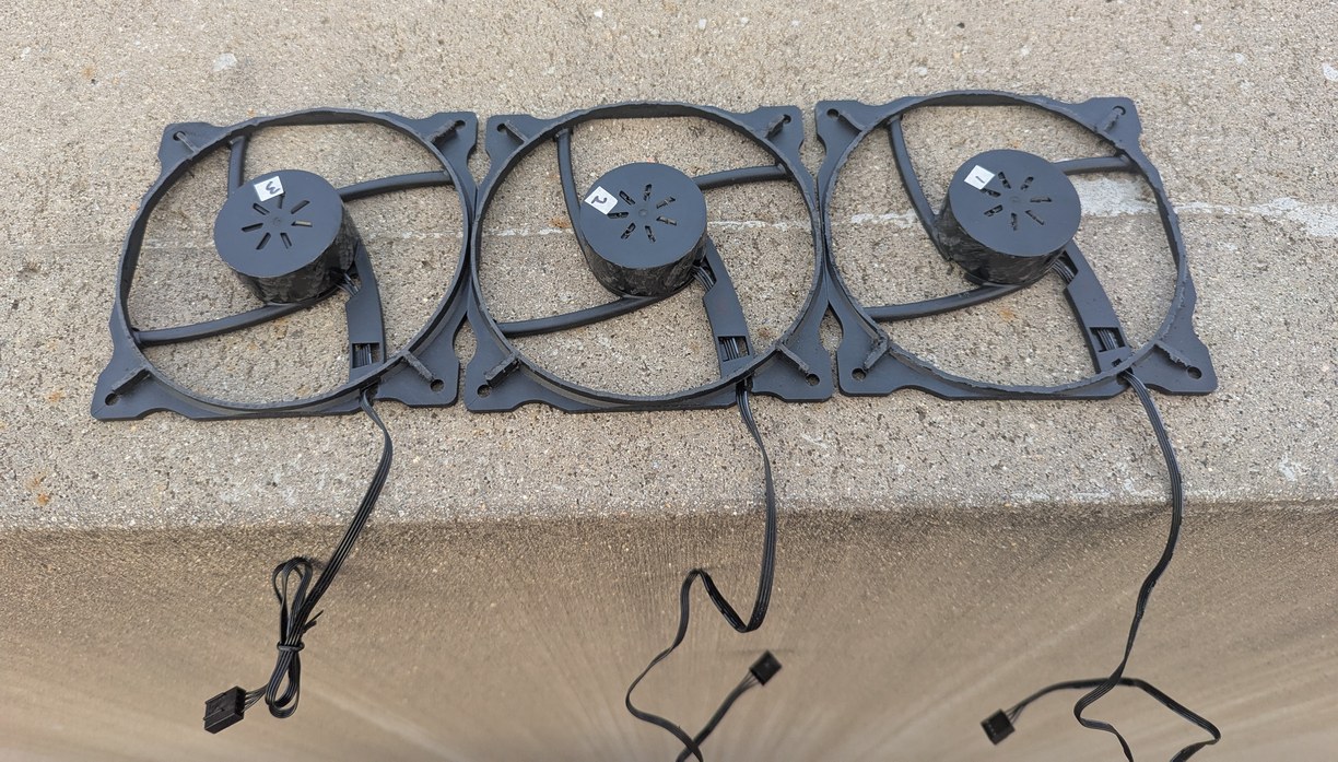On left, a comparison of a 12 V PC fan, after and before removing the blades and half of the outer case with a hand-held rotary tool (along with adding ventilation holes for the stator). On right, this process is repeated 3 times to have extra motors to work with in case some of them get broken in future steps.