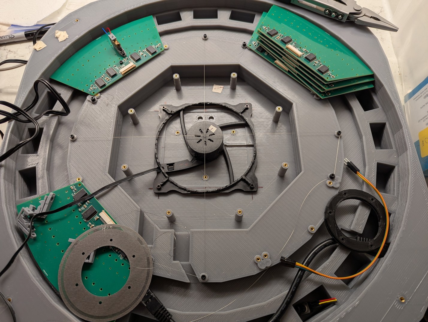 On left the 3D printed projector base, and on right the circuit boards, encoder ring, and motor mount on top of the projector lid.