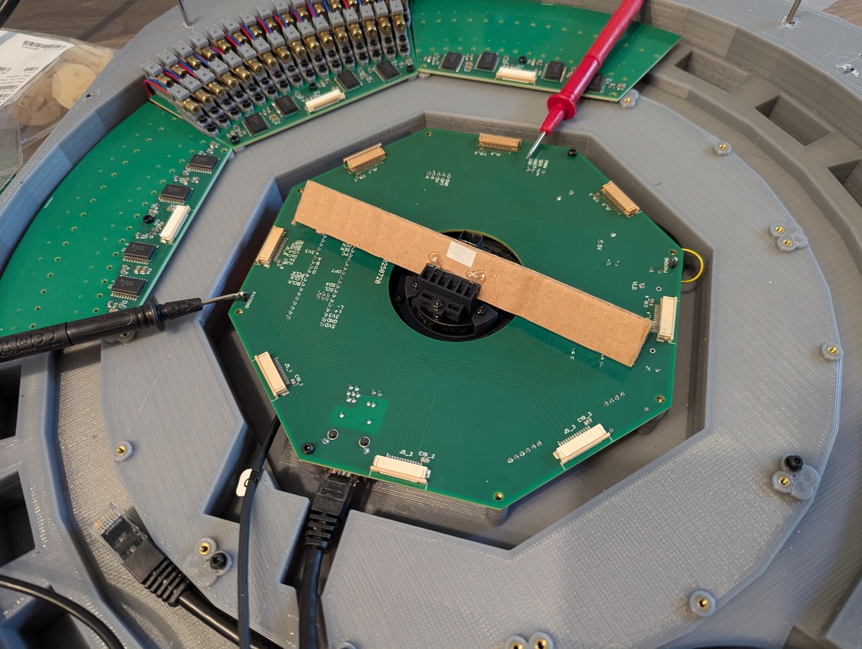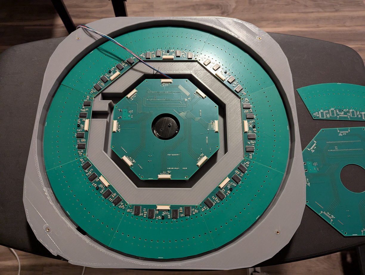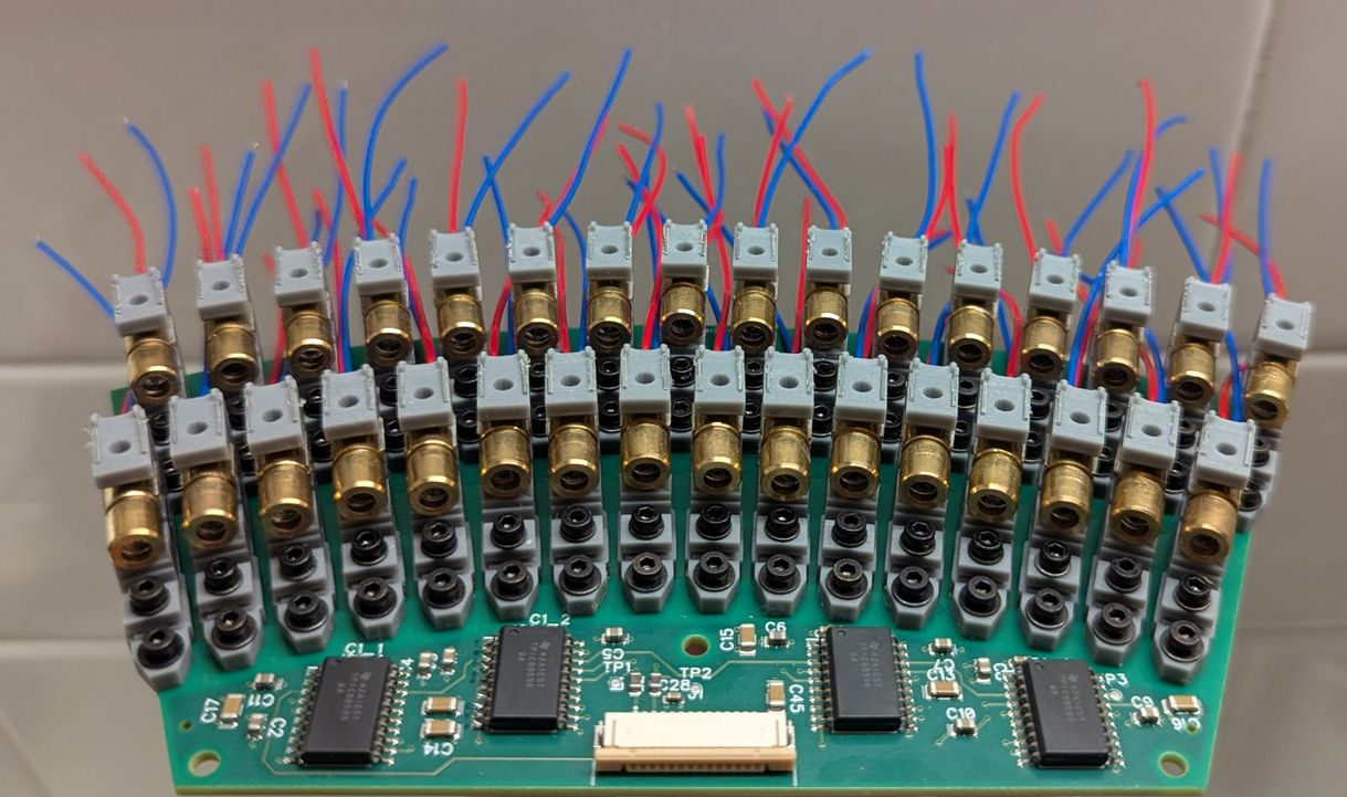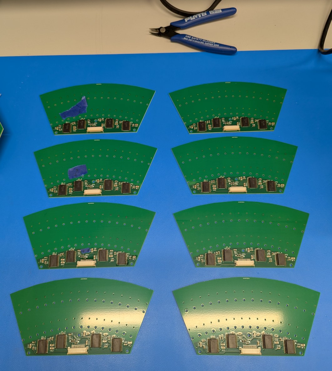 The parts arrived and I was eager to test the mechanical assembly process. Everything fit as designed! Some of the LD boards were not fully level, but that would be a problem for later (I used 3 bolt holes on each board, to allow shim washers to be inserted to adjust the LD board angle). I completed the PCB soldering in about six hours, with the reduced number of components (in particular, the buffers, shift registers, and 8x parallel resistors) being a big help in achieving this. I used solder paste that was marked to expire in 2023 but which seemed to work not particularly different to when I first opened it (it may have become slightly less tacky and more prone to detaching from components during reflow, due to the flux being weakened over time, which caused a few IC pins to not be fully soldered). For the reflow, I used the same toaster oven technique as in the acoustic camera project. The detaching components were fixed manually with a soldering iron after visual inspection identified the affected pads. The through-hole components were also soldered manually.