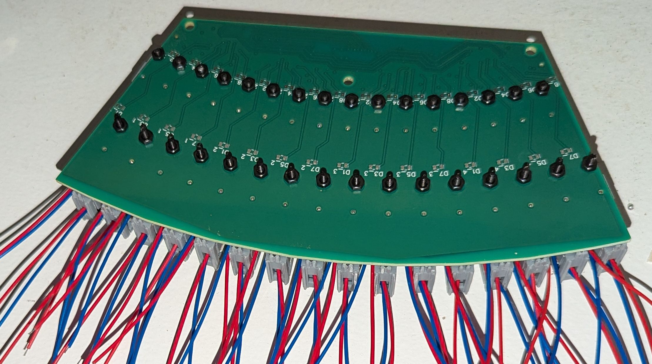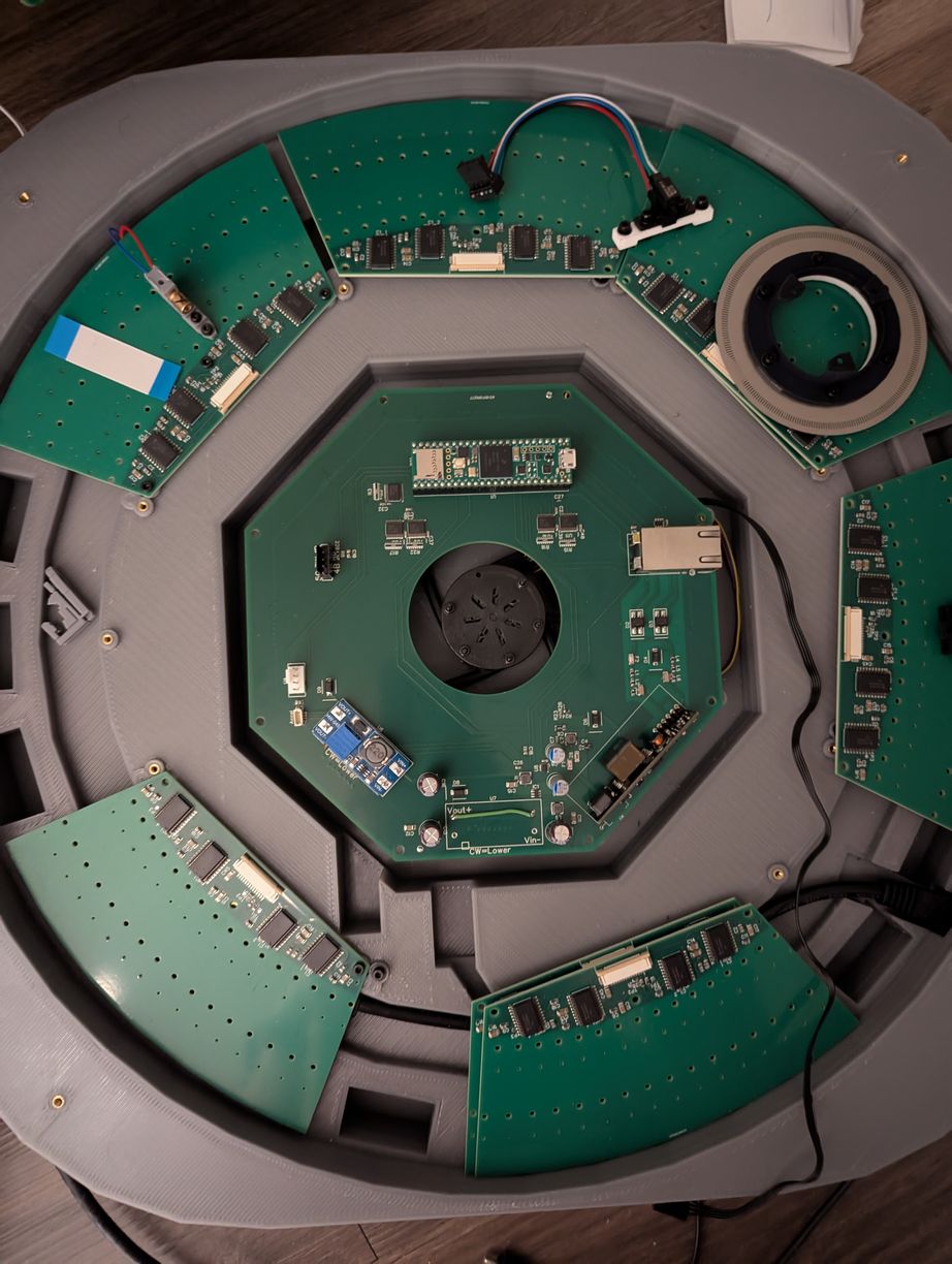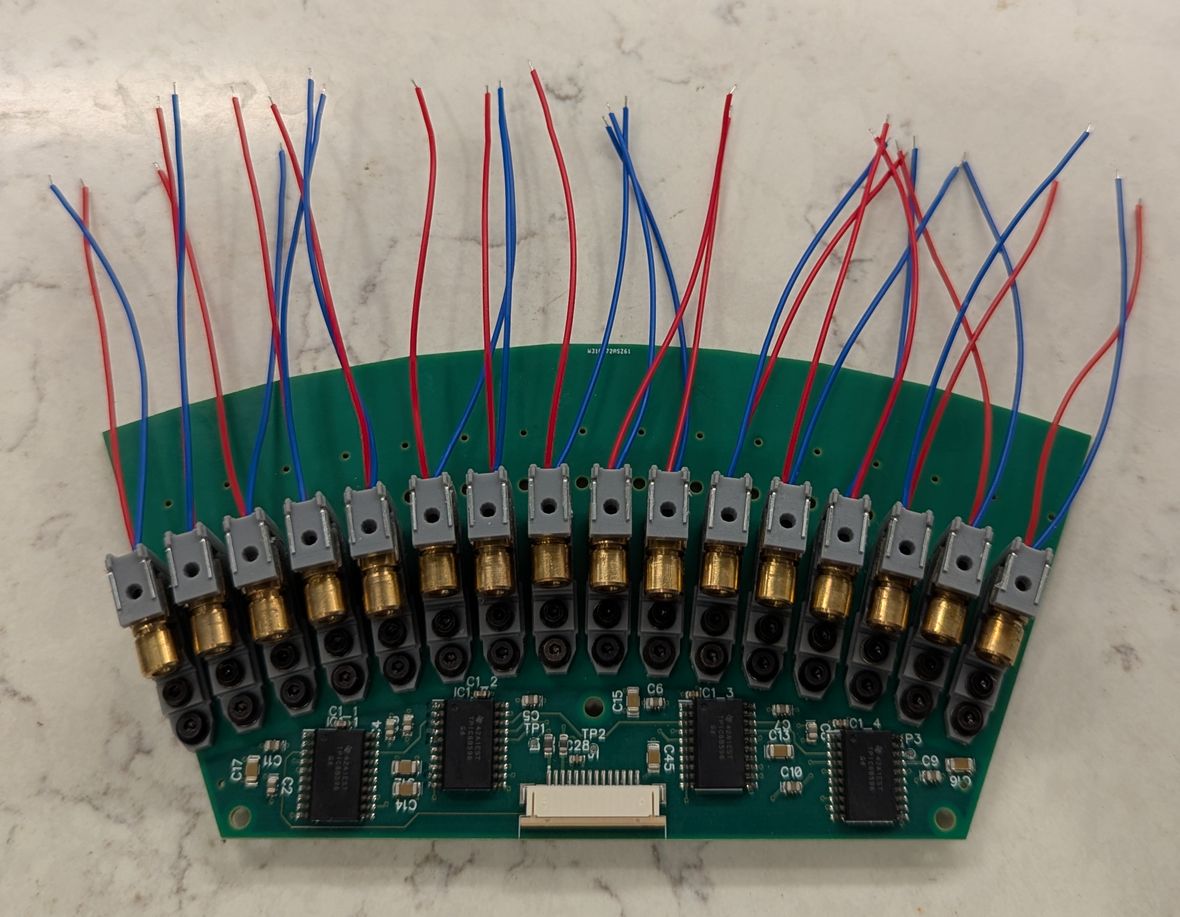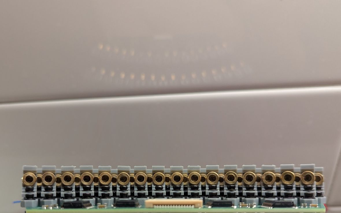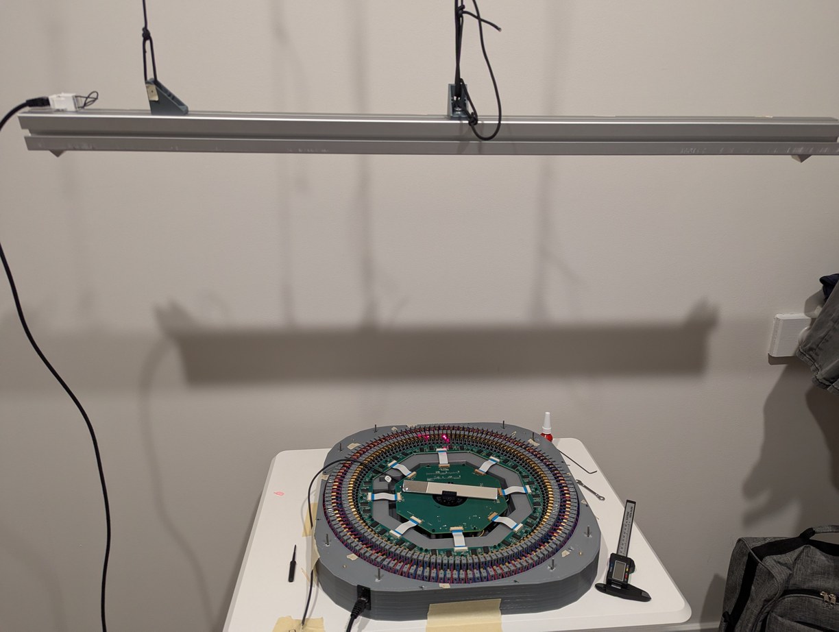 The parts arrived and I was eager to test the mechanical assembly process. Everything fit as designed! Some of the LD boards were not fully level, but that would be a problem for later (I used 3 bolt holes on each board, to allow shim washers to be inserted to adjust the LD board angle). I completed the PCB soldering in about six hours, with the reduced number of components (in particular, the buffers, shift registers, and 8x parallel resistors) being a big help in achieving this. I used solder paste that was marked to expire in 2023 but which seemed to work not particularly different to when I first opened it (it may have become slightly less tacky and more prone to detaching from components during reflow, due to the flux being weakened over time, which caused a few IC pins to not be fully soldered). For the reflow, I used the same toaster oven technique as in the acoustic camera project. The detaching components were fixed manually with a soldering iron after visual inspection identified the affected pads. The through-hole components were also soldered manually.