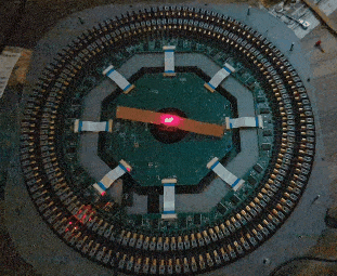 In the initial design of a doubly-rotating mirror, the properly calculated reflection of the laser beam deflected along two axes instead of one, resulting in messy disjoint spiral patterns rather than nice circles as hoped from an incorrect intuition. However this presents an opportunity - since a mirror can reflect a beam along two axes, there is no need to have a second spin axis. Rather, a properly angled mirror spinning along one axis will generate the desired projection pattern. Compared to the doubly-spinning mirror, there is a lack of laser multiplication, which means the number of lasers will need to be physically increased. This is not wholly negative, since the effective laser spot velocity is lower, the timing accuracy requirements are reduced and the projected pixel is brighter (the laser is on for a longer period of time). As we already anticipate being limited by laser brightness, reducing the multiplication factor presents an advantage. Although aligning 256 lasers instead of 128 doubles the required effort, the laser alignment mechanisms already need to be designed and are readily accessible, so mechanically this is not a challenge. The more pertinent limit ends up being the overall size of the projector, where we must squeeze the laser diodes tightly together in a two-circle arrangement to remain within a 40 cm bounding box (for the sake of mechanical rigidity of the optical path and ability to carry the projector).
