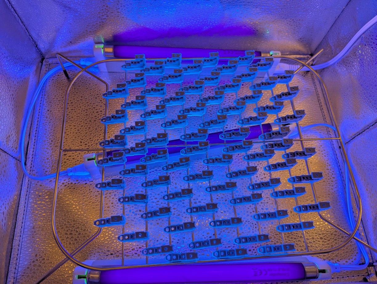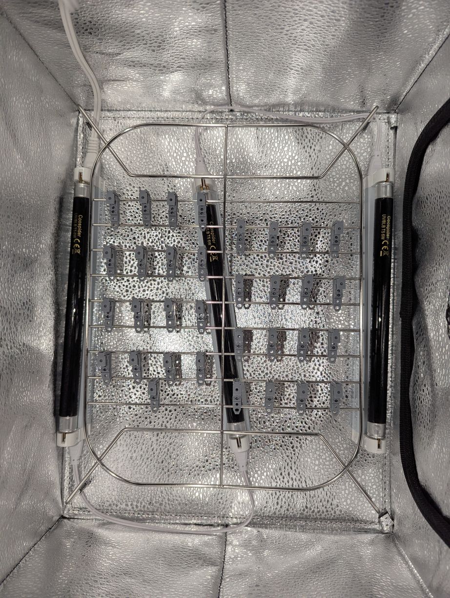 Curing a batch of LD holders in a reflective enclosure with UV lamps.