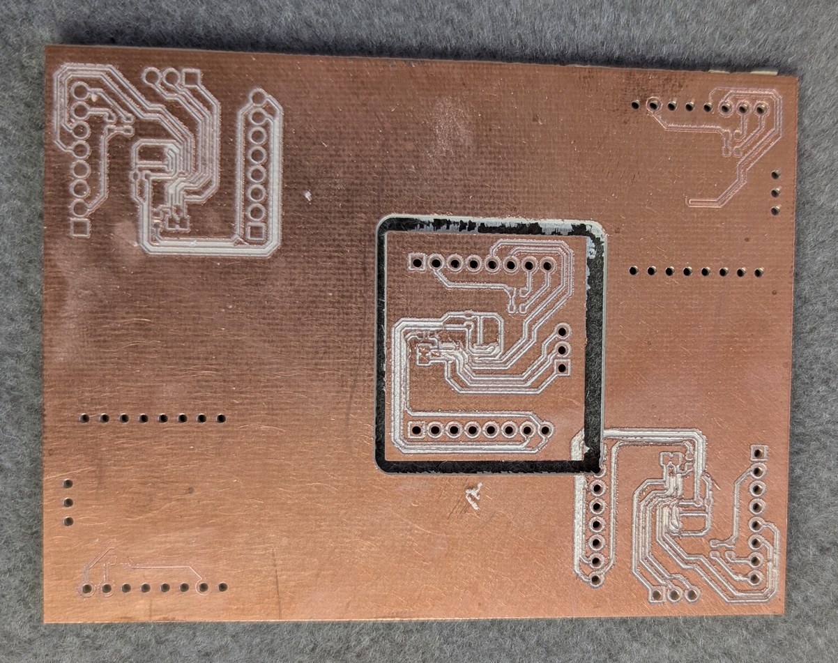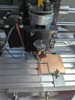 Photos of milling the PCB for digital potentiometer. In the first photo, on the upper right a linear bearing can be seen coming out of the 3D printed part, and the mill motor is dropping down inside its holder. In the second photo, a number of failed attempts at milling the board can be seen, along with the final part which was not great but functional.