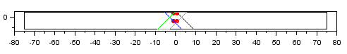 A projected view of the mirror size as seen by the laser diode as the mirror spins. As reflection angles near the horizon are reached, the required mirror size quickly balloons towards infinity due to the tangent relation. A 150 mm wide mirror tilted at 45 degrees, simulated in this plot (black rectangle as seen at 0 degrees incidence angle), is just adequate to fit a 2 mm wide and 4 mm tall laser beam (the corners of which are marked by the red points in the plot) at 87.7 degrees incidence angle (blue and green polygons).