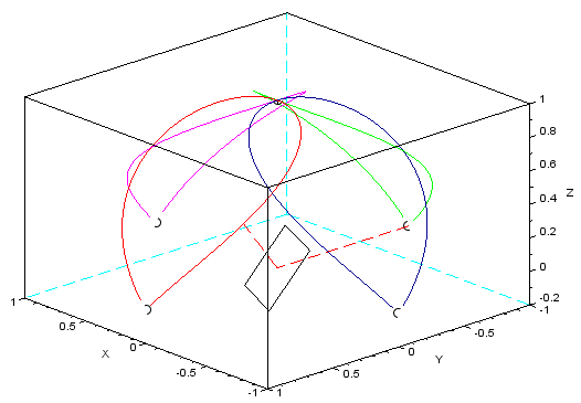 A 3D plot of the reflected laser path for four laser diodes (four different color curves) in the XY plane (LD locations marked with dots). Adding more lasers increases the density of these curves for higher pixel resolution. The laser path from the LD at (0,-1,0) to the mirror reflection at (0,0,0) and to the red projected curve is illustrated with a red dashed line. The other curves are generated when the mirror rotates to face other LDs.