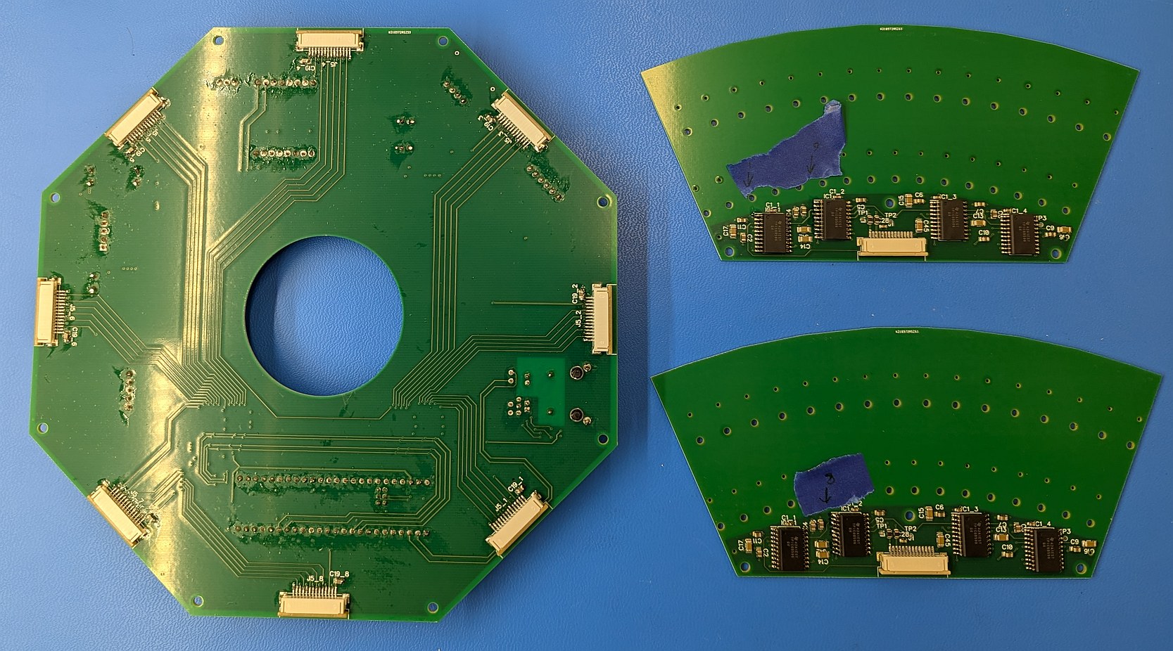 Manually soldering the through-hole components on main PCB and fixing bad connections on the LD PCB. On right, the main PCB after washing off the flux residue.