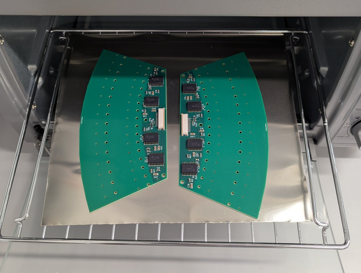 Soldering the LD boards in a toaster oven (a sheet metal cover is placed on top of the boards for even heating, the cover is removed for the photo), followed by optical inspection to identify bad solder joints for manual rework.