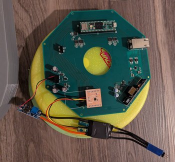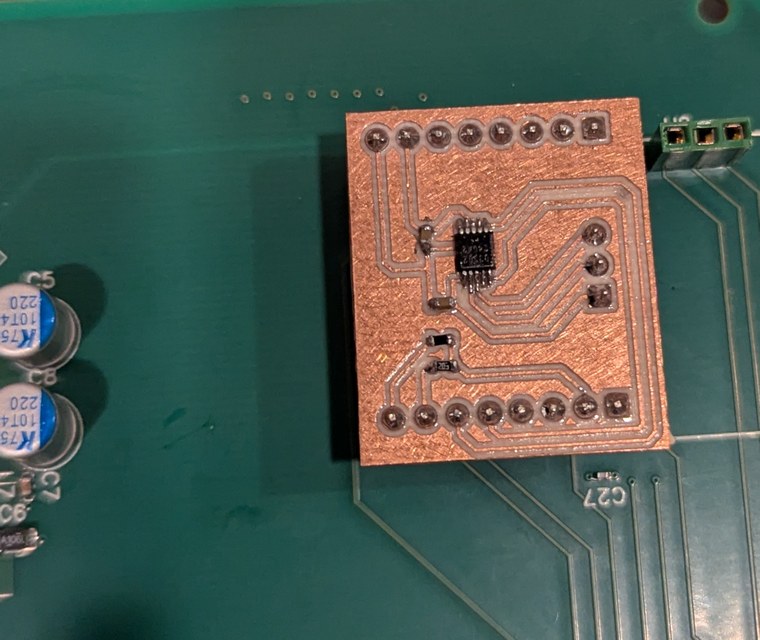 The difficulties were not over yet (of course). Next I added flux and solder to the pads, then soldered the surface mount components careful to not bridge the tiny 0.2 mm gaps between traces. The absence of a soldermask makes this difficult. However even after soldering everything without bridging gaps, I could measure resistance between traces. This was due to the solder flux residue collecting in the milled grooves around the traces and providing a somewhat conductive path across the isolation barrier (I also encountered this in the touchpad controller project). Soldermask on a commercially made PCB means that often this effect can be ignored since most of the trace area is not exposed to the flux, however with the milled PCB this has to be taken into consideration, especially when there is a need to work with analog signals. Also the type of flux matters. The flux I used this time was paste from an old can and probably meant for plumbing rather than electronics, its residue was conductive and not water-soluble so presented more difficulty to remove. I soaked the PCB in a small container of flux cleaner for about 10 minutes, then wiped dry with a paper towel and confirmed isolation between traces with an ohmmeter. It took a few repetitions of these steps, each time the resistance slightly increasing, until above the 60 Mohm maximum of the ohmmeter, which I considered good enough. Finally I applied a conformal coating to insulate the board from potential shorting of traces by stray metal pieces. From the factory, the DS3502 defaults to a centered potentiometer wiper, which would cause the motor to start spinning at power-up, so before connecting to the ESC, the DS3502 non-volatile memory was programmed to start with a zero output. This way the ESC receives a low signal from power-up until programmed otherwise by the MCU.
