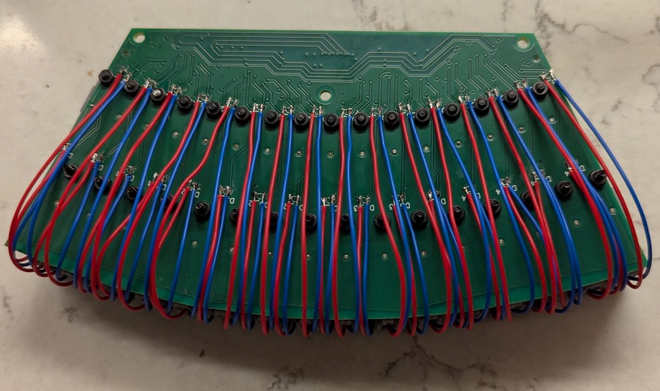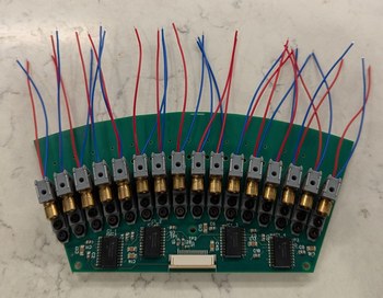 The wires for the 32 LDs are soldered to pads on the underside of the board. Then, hot glue is used to secure the M2 nuts, so it is possible to remove and replace LD holders from the top of the board after installation in the projector base.