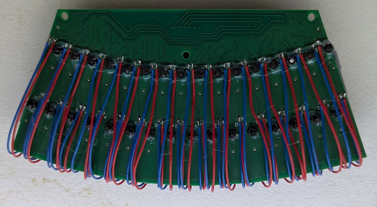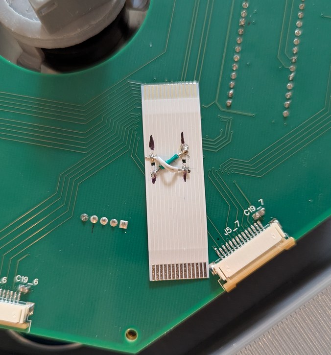 I set up one laser diode in a prototype LD holder in a position on one of the LD boards, and connected this to the main board (after removing the encoder ring test jig, so everything could fit back into the case again). Looking back over the schematics I noticed one problem - the line buffers were not tolerant of voltage above Vcc on the input pins, and in the case where the Teensy was powered by USB and there was no PoE power, this could occur. Thus I added a simple resistive divider (onto the ESC interface board) which could be read by the Teensy to confirm PoE power is present before sending outputs to the buffers. Meanwhile I just had to remember not to operate in this state. But this was not the only problem, as the laser diode would not turn on, after programmatically toggling ("bit-banging") the lines at 500 kHz. The unthinkable had happened - the 14-pin connector signals on the main board and LD boards did not match up! This was made worse by the fact that I knew something like this could be a risk so I checked and even double-checked the connectors before ordering the boards, but in the intervening period I must have decided to change the signal order. It felt like the oracle's premonition - you can try to avoid it, but it will happen anyway! There was no way to fix this in software, as one of the affected pins carried the data for each LD board, which was wired differently from the clock and reset signals that were common to all LD boards. At least the ground and power pins matched up correctly (I triple-checked those) so I did not destroy all the circuitry. Having just soldered all 9 boards, I was not interested in repeating any of that work, so I sought to repair the fewest affected traces, with software pin re-assignments handling the rest. Unfortunately this meant that my carefully laid out, impedance-controlled(-ish) traces would be changed to EMI-radiating jumper wires, defeating the whole point of using 4-layer PCBs. There's no avoiding being humbled before the digital design gods.
