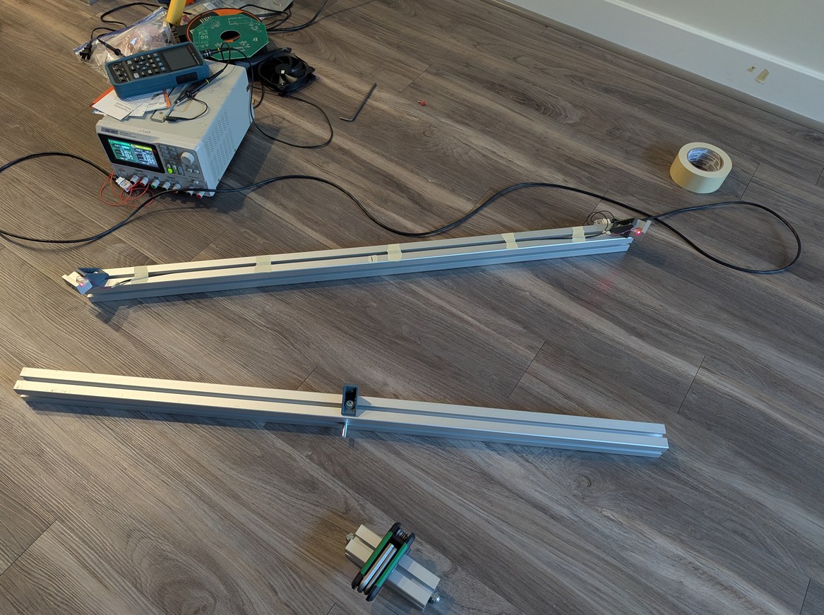 The motor spinning the mirror should rotate at a steady 30 Hz with minimal vibration. There is almost no load required to maintain this rotation (or so I thought). A good choice would be a small induction motor, such as used for precision gyroscopes, however I was not able to readily purchase one. Instead I use a brushless motor designed for a camera gimbal, which implies that it operates well at low speed (has a low "KV", or rotational speed per volt of input, rating). To drive this motor I considered two options - a no-name ESC (electric speed controller) from Amazon, or the TI MCF8316 which implements Field-Oriented Control. The ESC is clearly rated for higher power motors, and the MCF8316 is a single component that could fit nicely on a circuit board, so I thought it would be good for this application. I bought a "Brushless 33" module from MIKROE which contains this IC (for which I added headers on the main PCB), and spent over two weeks trying to get it to consistently run the motor. Supposedly this can automatically sense motor parameters using a routine, but when I tried running this routine it always failed. After manually measuring the motor resistance, inductance, and back-EMF, and entering those parameters, the routine would work about 10% of the time and give different answers for the P and I parameters of the speed loop. There were about 100 different parameters to go through to try and get something functional. Even after a bunch of tuning, the motor would start up maybe 10% of the time, of which 2/3 of the times there would be an anomalous high current draw with associated jittery noise, and occasionally the current draw would reach the limit of my power supply and shut down the chip. When it did run, the speed was audibly inconsistent (varying over 0.5 Hz at 30 Hz). I could get a consistent speed when the chip was running in open loop, but the setting meant to keep the chip in open loop also did not work in the way that would be usable for this project. Overall it was a very frustrating and unfruitful experience (and not for the first time - my attempts to get TI's FOC products working with the hoverboard and mc2 projects were similarly disappointing), and based on TI forum posts, I wasn't the only one with this experience (there is even a post specifically about difficulties with camera gimbal motors). There was little flexibility in motor choice at this point as I had sized every other part in the project around it, leading to a few stressful hours as I wondered whether all is lost. Then I connected the ESC to the motor and it just worked, no tuning or coding required. Furthermore, the current draw at load (2 mA to 3 mA) was half or less of the best case of the MCF8316 (6 mA to 7 mA), and the speed control was much more stable. It did not start up successfully every time, however in that case the motor stopped and this could be identified using the encoder seeing no transitions, whereas the MCF8316 would sometimes shake the motor continuously instead of spinning it (somehow falsely thinking it was in closed loop operation) which would not be easy to identify with the encoder. It also never drew a high current from the power supply. Overall the cheaper option here was easier and better, despite not being designed for this use case (one thing to note is that supposedly motors can be wound for trapezoidal or sinusoidal commutation, and possibly if this was a trapezoidal wound motor it would not work well with the sinusoidal FOC method, but this does not justify the difficulties encountered with getting the MCF8316 to do anything in a consistent manner). It would still be nice to drive the motor in open-loop mode at constant speed, but the approximately 0.05 Hz stability of the ESC near 30 Hz was sufficient for this project. While the Teensy has the capability to output constant frequency 3 phase PWM waveforms without much difficulty, I did not want this to turn into a motor controller project, so I chose to use the ESC.