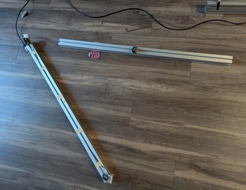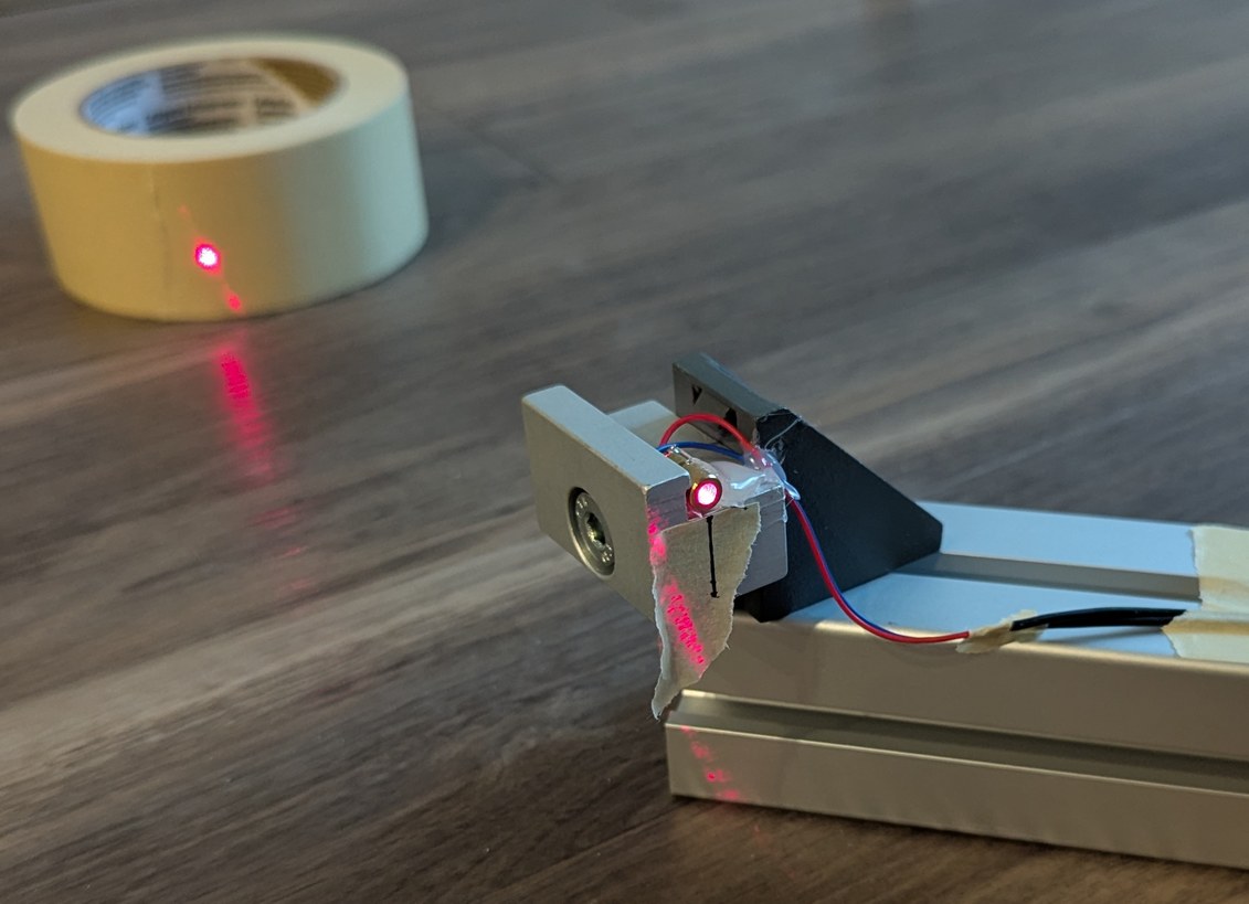 Preparation of the 90 degree reference, by attaching two LDs and ensuring the beams intersect at 90 degrees, through measuring the projected points on a distant wall. Further, a mirror is aligned to the beams (using a card to align the entire length of the aluminum extrusion) and used to draw a line under the LDs onto which the laser should be reflected if the spinning mirror is at 45 degrees.