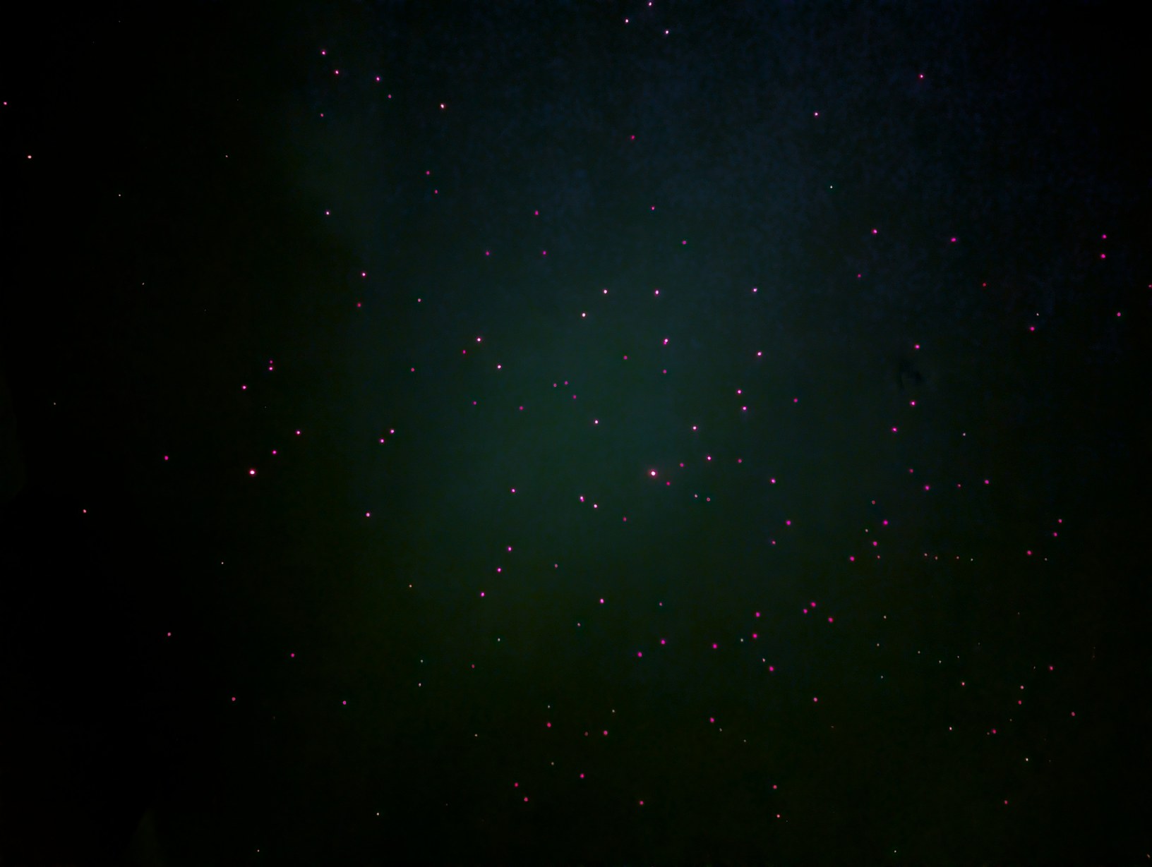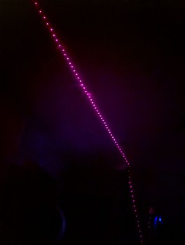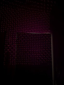 Another aspect of using this projector is, of course, the very wide field of view. Habitually I look towards a wall of the room to view the scene, like one would with a regular video projector, then I have to remind myself that there is a whole another half of the scene that is happening behind me! This gave good training in being aware of the full surroundings when observing the virtual sky, and how to mentally combine the different images while turning my head to cover the projected region, which was one of the goals in building this project. The image is most accurate when viewed with one's head close to the projector, but in that case it is likely that one may look into a laser beam coming from the projector. At the laser duty cycles involved here, this occurrence is slightly uncomfortable but should not involve any risk of ocular injury (this is a benefit of using 256 low power lasers instead of 1 high power laser).