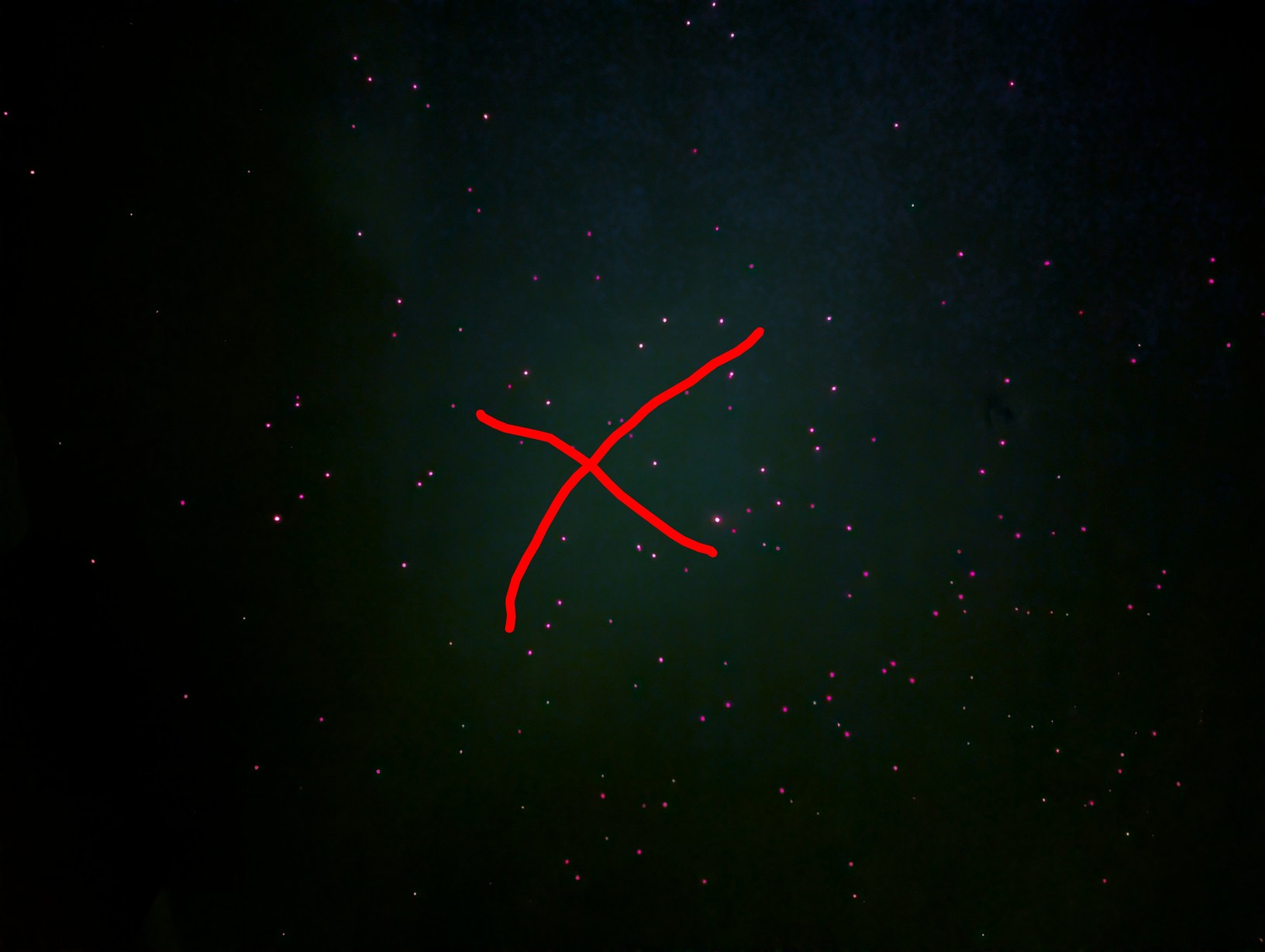 Aligning pixels by crossing Xs, on left before and on right after alignment, with 3 more Xs around the zenith which are out of the field of view of the camera which all need to intersect.