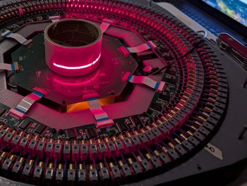 The center of the rotor is found and then 6 holes are drilled at the outside of the rotor. M2 bolts are inserted from the bottom, through a small slot cut under the rotor (seen towards the bottom of the photo), and then a nut is placed on top and tightened, after which the threaded section coming out of the rotor can be used for attaching the encoder ring and mirror.