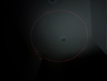 Dots formed by the same LDs after alignment to the centering structure on the back of the mirror holder. The dots at the circumference are regularly spaced, and all beams intersect at the virtual center point as intended.