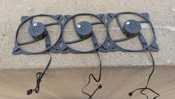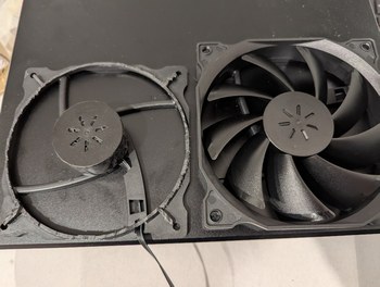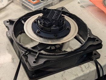 With the ESC and DS3502 connected to the main board, it was possible to spin up the motor. It reached the target 30 Hz with a bit over 13 V, requiring a boost converter connected to the main 5 V rail, for which I used a small MT3608 board bought on Amazon (I checked that when the 5 V input is turned off, the output of the board does not exceed the setpoint, but just in case I added a 15 V Zener diode to prevent over-voltage on the ESC). However the more I experimented with this configuration, the more I became concerned about the noise level. The gimbal motor was not intended to be used in this manner, and when spinning at 30 Hz the bearings made annoying vibrating, clicking, and bouncing noises. With so much noise, it would be difficult to concentrate on the faint projected points when the device is in operation, and it would detract from its performance. Thus again I found myself in a tricky situation. If only there was a motor that could be guaranteed to be silent and was designed for the 30 Hz speed range at low load... A brushless motor such as used for drones or drills is not a good choice, because it is intended for higher speeds and higher powers, and makes lots of noise due to the bearings used. After some pondering, I found that a PC cooling fan motor would be a good choice. These fans spin at about 1800 RPM, have relatively low torque requirements, and are designed for quiet operation. Even better, they have a built-in controller so I don't have to deal with those complications again.