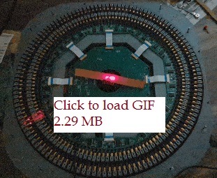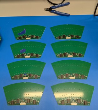 Placing the first 16, then 32 LDs on the LD PCB. On right, the view of the LDs from approximately the virtual center point, illustrating how the gaps between inner arc LDs are sized to just allow the laser beams from the outer arc LDs to pass through. In this way laser beam density is maximized given the 6 mm LD package.