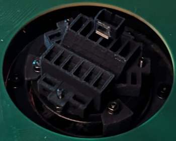 Since the projector base was not originally intended for this motor, it was necessary to insert new melt-in nuts in the correct locations. To find these locations, the motor was centered using thin intersecting wires referenced to PCB attachment points that are intended to be perpendicular.
