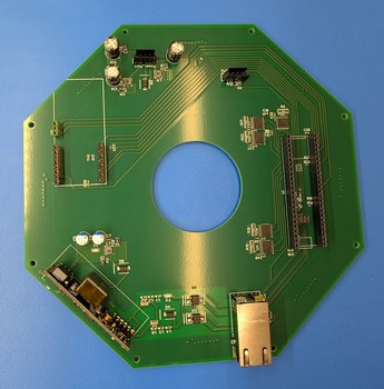 I designed the main circuit board with PoE power supply and Teensy 4.1 with ethernet connection, and 8 outputs to LD boards. Each LD board houses 32 LDs in a 1/8 circle pattern, with 4 8-channel TPIC6B596 power shift registers which are connected directly to the LDs (this was a great choice as it decreases the number of components on the boards, and with the looming task of aligning the LDs, I was happy to make the PCB assembly as simple as possible). Having freshly read through Johnsons and Graham's "High Speed Digital Design" book, I tried to apply their best-practices advice when designing the boards. However I found that replicating their nice diagrams of clock distribution trace layout would leave no room for any other traces, and conversely adding other traces would make the layout no longer match the nice diagrams. I would feel like I perfectly understood the problem after reading a few paragraphs in the book, and then the elation would be crushed by all the other stuff that needed to be routed in the same layer and across the path of the signal, causing possible interference and cross-talk. I used a 4 layer stack on all the PCBs, hoping that a large continuous ground plane would cover up any suboptimal choices in the routing. The biggest exception is on the LD boards, the ground plane does not extend into the section of the board under the LD holders, to ensure a flat surface for the LD holders to sit on. When signals switched between top and bottom layers, I placed capacitors that would help couple the return current between the two inner layers (ground and 5V) near the signal vias. I also tried controlling the trace impedance for the signals to LD boards, at least roughly. At first I was so enthused with having the cleanest signals that I had a voltage translator (from Teensy 3.3V to 5V for the TPIC6B596), a buffer to parallel 1 signal to 8 boards, then another buffer on the LD boards to receive the signals, all with terminating resistors to avoid reflections. In principle this is a decent approach for large distances (if this is done, the buffers should be inverting to better maintain duty cycle), but as the entire system fits within 50 cm, this many buffer ICs would be excessive. In the final version this was reduced to a single buffer (SN74ACT8541PWR) with source termination resistors, and a trace layout that places the 4 receiving TPICs (on each LD board) in a chain rather than star pattern, so the impedance of the trace to the ground plane was mostly constant. The buffer is capable of accepting 3.3V input for 5V outputs, and of driving lines as low as 50 ohm impedance. I use a flat ribbon cable to connect the LD boards to the main board which has neighboring line impedance of about 80 ohm, so I chose the minimum trace width of 0.15 mm for the clock and signal lines which I expected to give about 71 ohm, and a 63 ohm resistor on the buffer output (which I estimate ranges from about 6 ohm to 12 ohm). This is far from perfect matching, but is also better than no matching, so I would expect performance adequate for the task. Really since the clock here is barely above 1 MHz this effort was more of an exercise than a necessity, however it would be a great frustration if I go through all the trouble of building the device only to end up with randomly flickering and jittery outputs, so it seemed prudent to design for maintaining signal integrity and minimizing interferences.