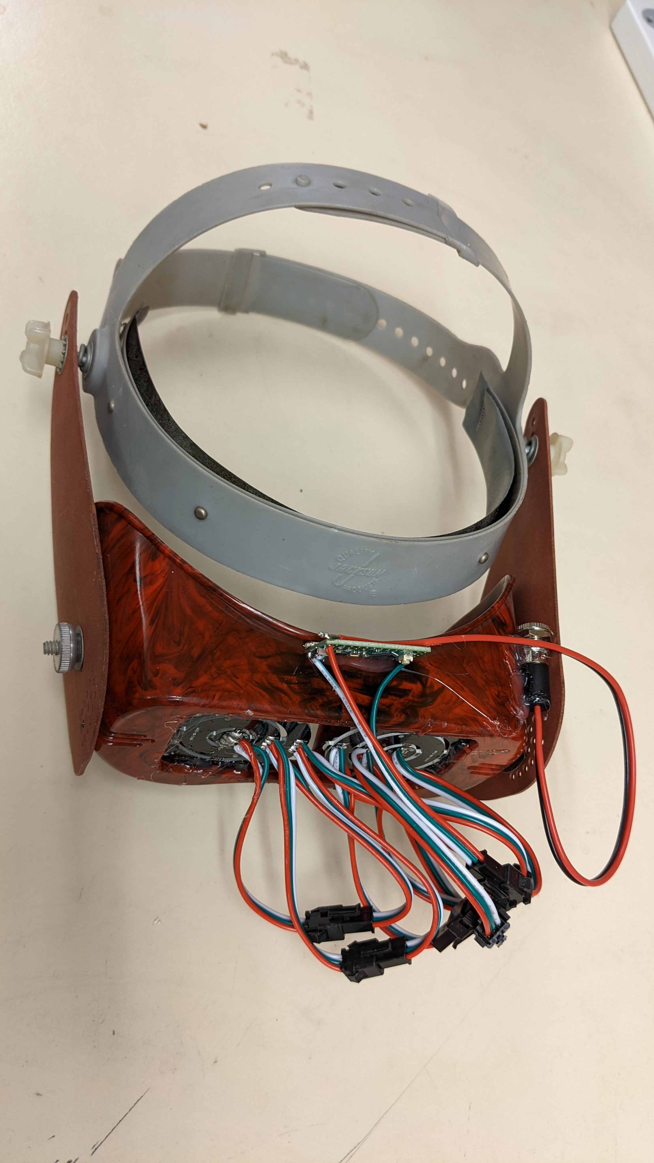 The LED rings are glued inside the frame of old welding goggles, making something that looks like a sci-fi movie prop. When placed so close to the eyes, the light from the LEDs is bright, as intended to simulate sunlight. With the eyes closed, the brightness is tolerable, similar to being outside on a sunny day.
