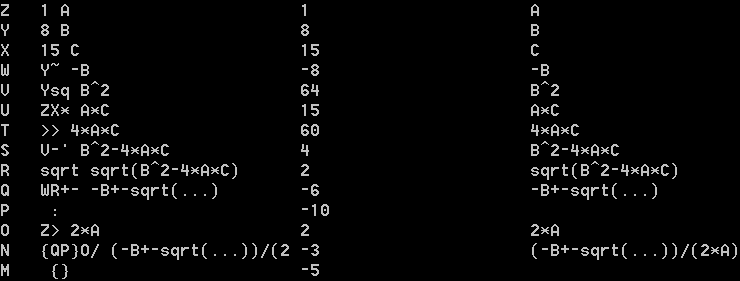 | quad | 3 | 2 | Quadratic equation solver, input A,B,C, return x such that A*x^2+B*x+C=0 |