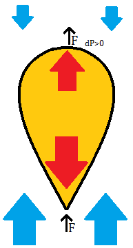 A model of a lighter than air balloon that is not externally pressurized: a non-stretchy but deformable material holds the gas in the "inverted teardrop" shape. A pressure difference arises on the top surface, which pulls the balloon upwards.