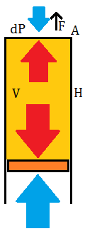 A vertical cylinder sealed at the top end and with a massless piston to seal the bottom end while keeping the pressure of the internal gas equal to the surrounding air at the bottom of the cylinder. In this case, the gas inside the cylinder will transmit its pressure more effectively to the top surface, so a pressure differential will exist there. This results in an upward force on the cylinder. Air pressure is indicated with blue arrows and gas pressure in the cylinder is indicated with red arrows.