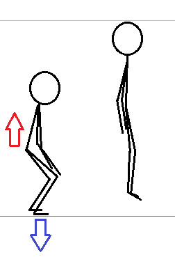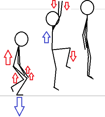 Cartoon illustration of taking off for a jump with one leg on the ground and the other leg accelerated up along with both arms. An extra force is exerted on the ground, stored as inertia in the moving limbs, and jump height is increased.